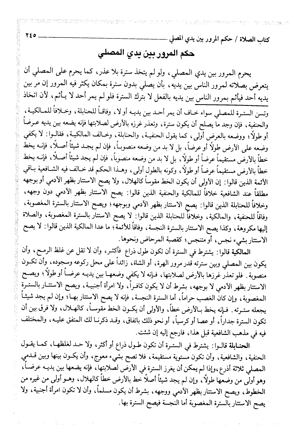وتسن السترة للمصلي سواء خاف أن يمر أحد بين يديه أو لا، وفاقاً للحنابلة، وخلافاً للمالكية، والحنفية، فإن وجد ما يصلح أن يكون سترة، وتعذر غرزة بالأرض لصلابتها فإنه يضعه بين يديه عرضاً أو طولاً؛ ووضعه بالعرض أولى، كما يقول الحنفية، والحنابلة، وخالف المالكية، فقالوا: لا يكفي وضعه على الأرض طولاً أو عرضاً، بل لا بد من وضعه منصوباً، فإن لم يجد شيئاً أصلاً، فإنه يخط خطاً بالأرض مستقيما عرضاً أو طولاً، بل لا بد من وضعه منصوباً، فإن لم يجد شيئاً أصلاً، فإنه يخط خطاً بالأرض مستقيماً عرضاً أو طولاً، وكونه بالطول أولى، وهذا الحكم قد خالف فيه الشافعية باقي الأئمة الذين قالوا: إن الأولى أن يكون الخط مقوساً كالهلال، ولا يصح الاستتار بظهر الآدمي أو بوجهه مطلقاً عند الشافعية خلافاً للمالكية والحنفية الذين قالوا: يصح الاستتار بظهر الآدمي دون وجهه، وخلافاً للحنابلة الذين قالوا: يصح الاستتار بظهر الآدمي وبوجهه؛ ويصح الاستتار بالسترة المغصوبة، وفاقاً للحنفية، والمالكية، وخلافاً للحنابلة الذين قالوا: لا يصح الاستتار بالسترة المغصوبة، والصلاة إليها مكروهة، وكذا يصح الاستتار بالسترة النجسة، وفاقاً للأئمة؛ ما عدا المالكية الذين قالوا: لا يصح