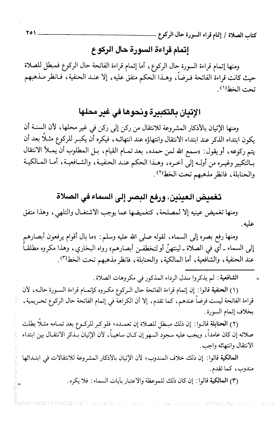 ومنها رفع بصره إلى السماء، لقوله صلى الله عليه وسلم: "ما بال أقوام يرفعون أبصارهم إلى السماء - أي في الصلاة - لينتهنّ أو لتخطفن أبصارهم" رواه البخاري، وهذا مكروه مطلقاً عند الحنفية، والشافعية، أما المالكية، والحنابلة، فانظر مذهبهم تحت الخط (¬3) .