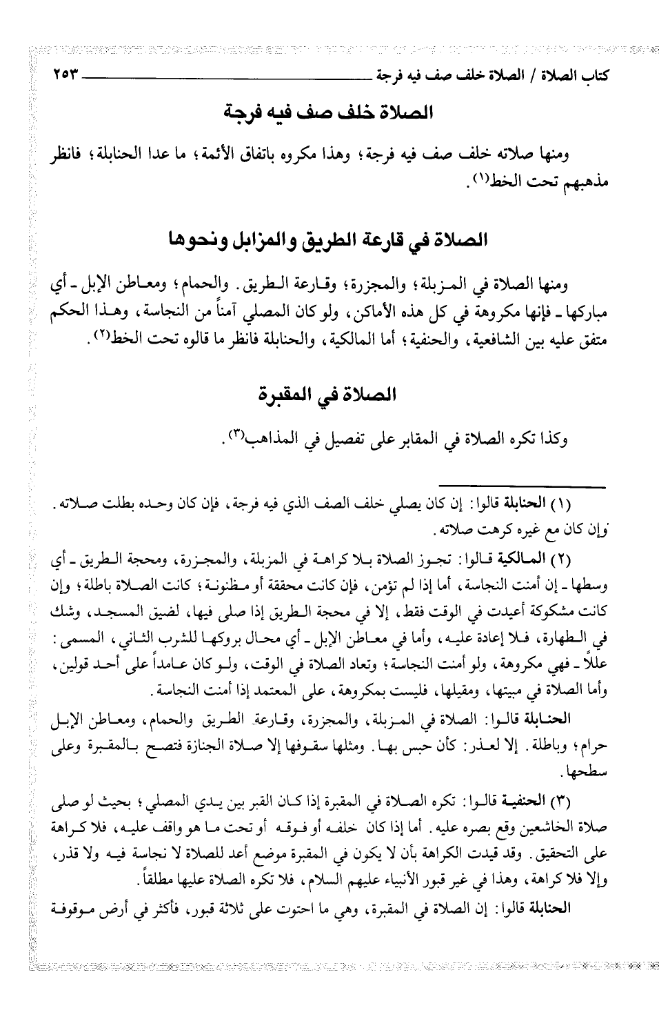 ومنها صلاته خلف صف فيه فرجة؛ وهذا مكروه باتفاق الأئمة؛ ما عدا الحنابلة؛ فانظر مذهبهم تحت الخط (¬1) .