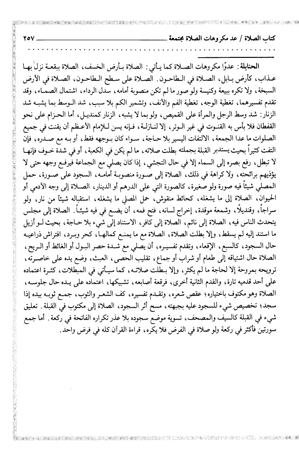 الحنابلة: عدّوا مكروهات الصلاة كما يأتي: الصلاة بأرض الخسف، الصلاة ببقعة نزل بها عذاب، كأرض بابل، الصلاة في الطاحون. الصلاة على سطح الطاحون، الصلاة في الأرض السبخة، ولا تكره ببيعة وكنيسة ولو صور ما لم تكن منصوبة أمامه، سدل الرداء، اشتمال الصماء، وقد تقدم تفسيرهما، تغطية الوجه، تغطية الفم والأنف، وتشمير الكم بلا سبب، شد الوسط بما يشبه شد الزنار: شد وسط الرجل والمرأة على القميص، ولو بما لا يشبه، الزنار كمنديل، أما الحزام على نحو القفطان فلا بأس به القنوت في غير الوتر، إلا لنازلة، فإنه يسن للإمام الأعظم أن يقنت في جميع الصلوات ما عدا الجمعة، الالتفات اليسير بلا حاجة، سواء كان بوجهه فقط، أو به مع صدره، فإن التفت كثيراً بحيث يستدبر القبلة بجملته بطلت صلاته، ما لم يكن في الكعبة، أو في شدة خوف فإنها لا تبطل، رفع بصره إلى السماء إلا في حال التجشي، إذا كان يصلي مع الجماعة فيرفع وجهه حتى لا يؤذيهم برائحته، ولا كراهة في ذلك، الصلاة إلى صورة منصوبة أمامه، السجود على صورة، حمل المصلي شيئاً فيه صورة ولو صغيرة، كالصورة التي على الدرهم أو الدينار، الصلاة إلى وجه الآدمي أو الحيوان، الصلاة إلى ما يشغله، كحائط منقوش، حمل المصلي ما يشغله، استقباله شيئاً من نار، ولو سراجاً، وقنديلاً، وشمعة موقدة، إخراج لسانه، فتح فمه، أن يضع في فيه شيئاً.