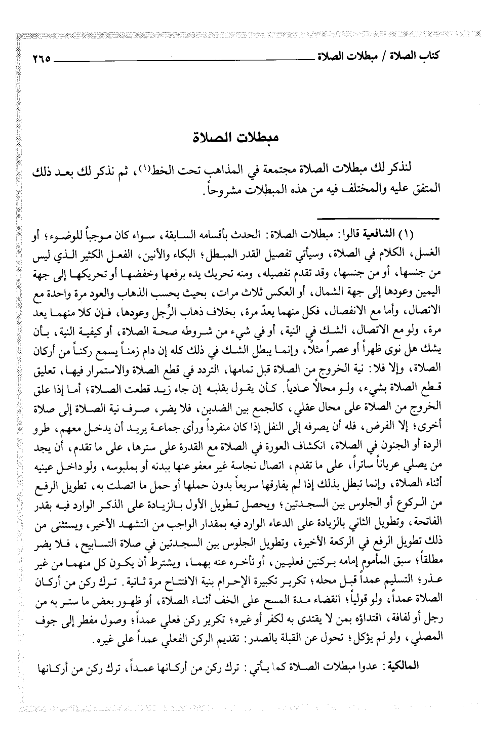 لنذكر لك مبطلات الصلاة مجتمعة في المذاهب تحت الخط (¬1) ، ثم نذكر لك بعد ذلك المتفق عليه والمختلف فيه من هذه المبطلات مشروحاً.