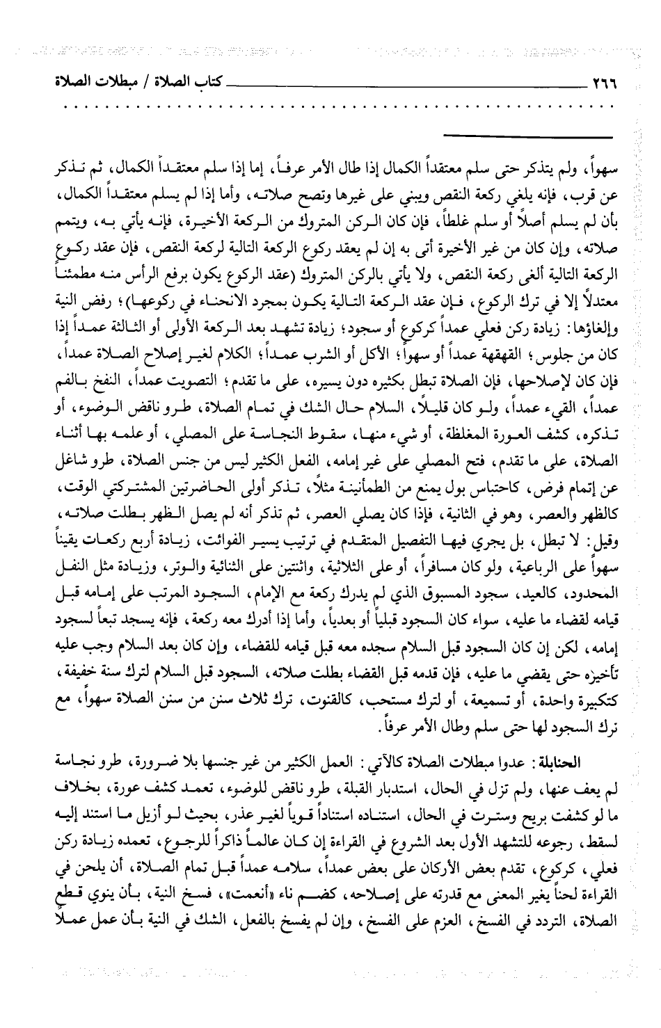سهواً، ولم يتذكر حتى سلم معتقداً إذا طال الأمر عرفاً، إما إذا سلم معتقداً الكمال، ثم تذكر عن قرب، فإنه يلغي ركعة النقص ويبني على غيرها وتصح صلاته، وأما إذا لم يسلم معتقداً الكمال، بأن لم يسلم أصلاً أو سلم غلطاً، فإن كان الركن المتروك من الركعة الأخيرة، فإنه يأتي به، ويتمم صلاته، وإن كان من غير الأخيرة أتى به إن لم يعقد ركوع الركعة التالية لركعة النقص، فإن عقد كوع الركعة التالية ألغى ركعة النقص، ولا يأتي بالركن المتروك (عقد الركوع برفع الرأس منه مطمئناً معتدلاً إلا في ترك الركوع، فإن عقد الركعة التالية يكون بمجرد الانحناء في ركوعها) ؛ رفض النية وإلغاؤها: زيادة ركن فعلي عمداً كركوع أو سجود؛ زيادة تشهد بعد الركعة الأولى أو الثالثة عمداً إذا كان من جلوس؛ القهقهة عمداً أو سهواً؛ الأكل أو الشرب عمداً؛ الكلام لغير إصلاح الصلاة عمداً، فإن كان لإصلاحها، فإن الصلاة تبطل بكثيره دون يسيره، على ما تقدم؛ التصويت عمداً، النفخ بالفم عمداً، القيء عمداً، ولو كان قليلاً، السلام حال الشك في تمام الصلاة، طرو ناقض الوضوء، أو تذكره، كشف العورة المغلظة، أو شيء منها، سقوط النجاسة على المصلي، أو علمه بها أثناء الصلاة، على ما تقدم، فتح المصلي على غير إمامه، الفعل الكثير ليس من جنس الصلاة، طرو شاغل عن إتمام فرض، كاحتباس بول يمنع من الطمأنينة مثلاً، تذكر أولى الحاضرتين المشتركتي الوقت، كالظهر والعصر، وهو في الثانية، فإذا كان يصلي العصر، ثم تذكر أنه لم يصل الظهر بطلت صلاته، وقيل: لا تبطل، بل يجري فيها التفصيل المتقدم في ترتيب يسير الفوائت، زيادة أربع ركعات يقيناً سهواً على الرباعية، ولو كان مسافراً، أو على الثلاثية،