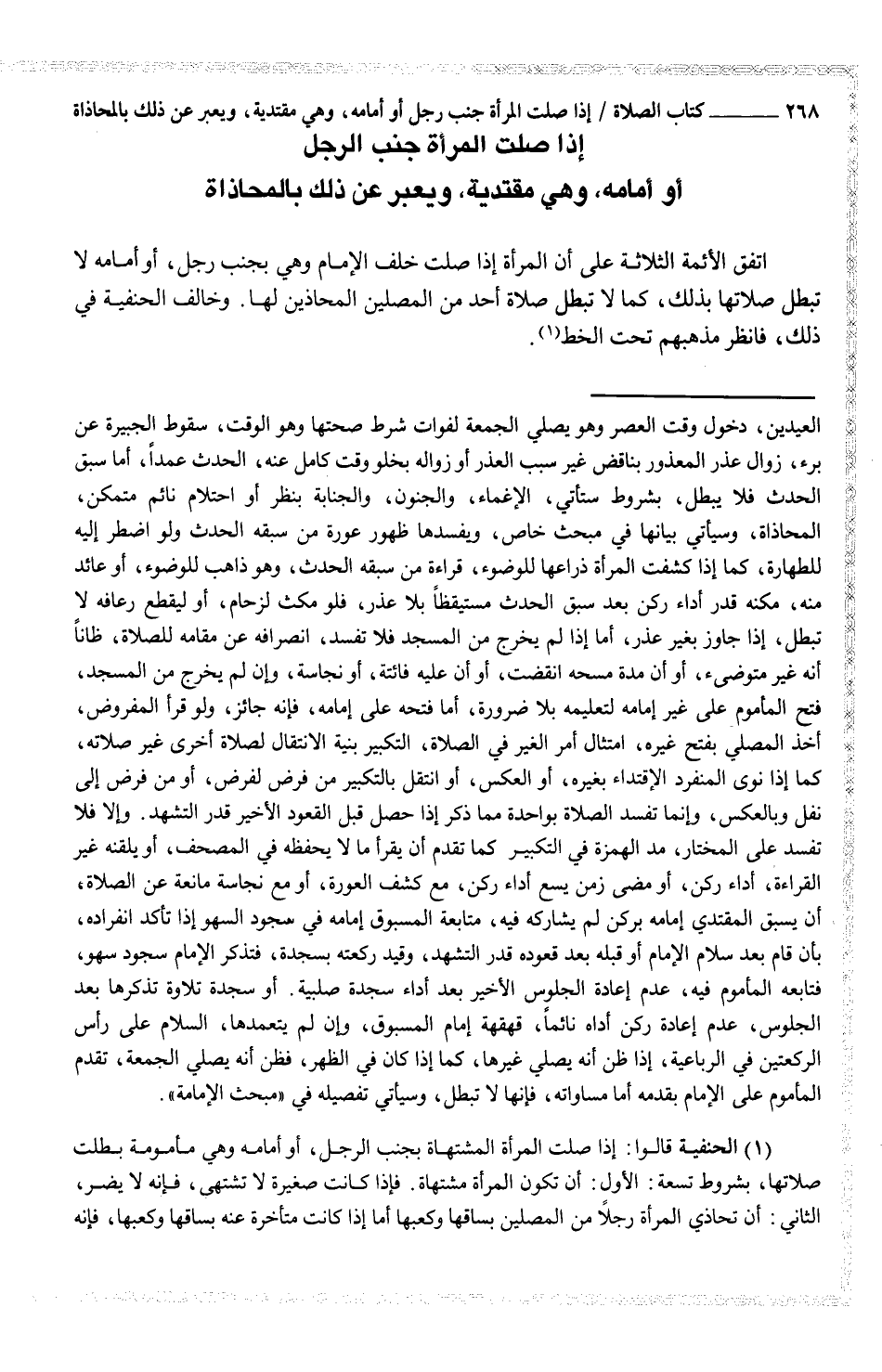(¬1) الحنفية قالوا: إذا صلت المرأة المشتهاة بجنب الرجل، أو أمامه وهي مأمومة بطلت صلاتها، بشروط تسعة: الأول: أن تكون المرأة مشتهاة. فإذا كانت صغير لا تشتهي، فإنه لا يضر، الثاني: أن تحاذي المرأة رجلاً من المصلين بساقها وكعبها أما إذا كانت متأخرة عنه بساقها وكعبها، فإنه