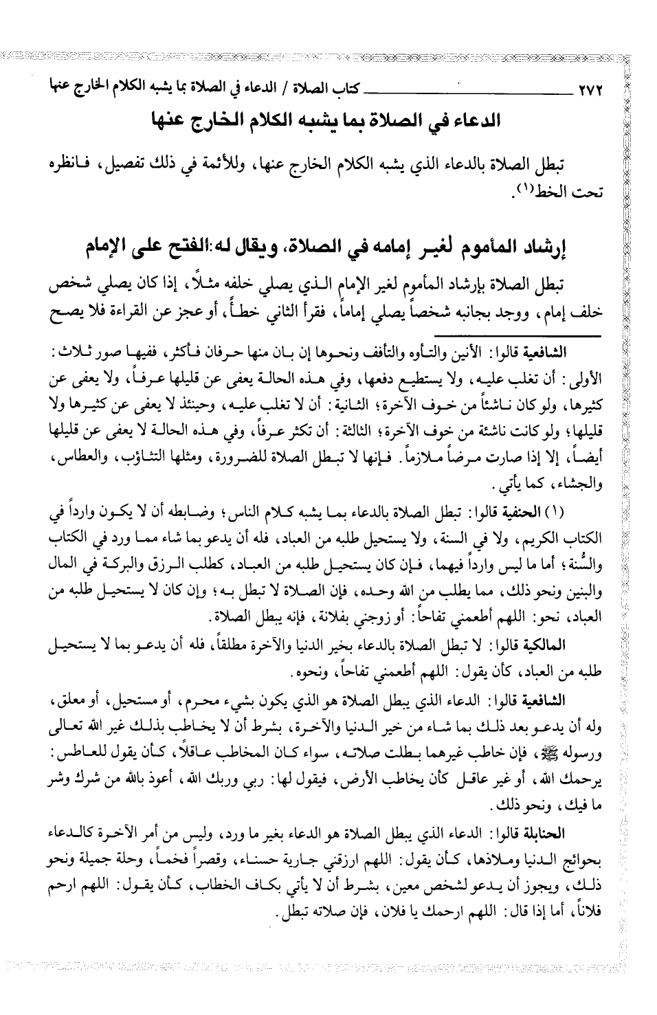 (¬1) الحنفية قالوا: تبطل الصلاة بالدعاء بما يشبه كلام الناس؛ وضابطه أن لا يكون وارداً في الكتاب الكريم، ولا في السنة، ولا يستحيل طلبه من العباد، فله أن يدعو بما شاء مما ورد في الكتاب والسُّنة؛ أما ما ليس وارداً فيهما، فإن كان يستحيل طلبه من العباد، كطلب الرزق والبركة في المال والبنين ونحو ذلك، مما يطلب من الله وحده، فإن الصلاة لا تبطل به؛ وإن كان لا يتسحيل طلبه من العباد، نحو: اللهم أطعمني تفاحاً: أو زوجني بفلانة، فإنه يبطل الصلاة.