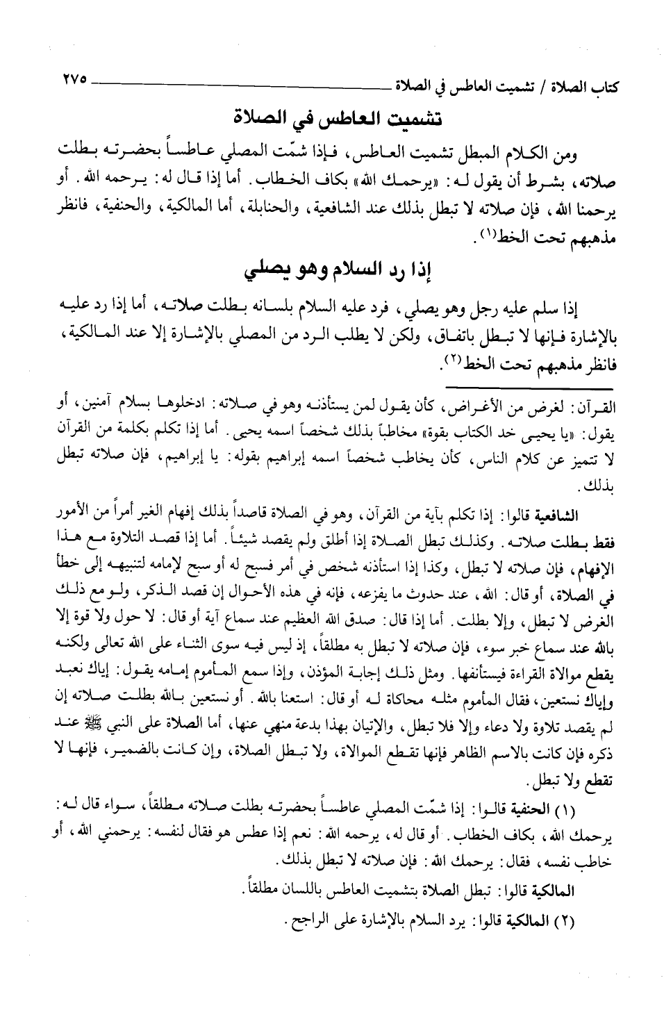 (¬1) الحنفية قالوا: إذا شمّت المصلي عاطساً بحضرته بطلت صلاته مطلقاً، سواء قال له: يرحمك الله، بكاف الخطاب. أو قال له، يرحمه الله: نعم إذا عطس هو فقال لنفسه: يرحمني الله، أو خاطب نفسه، فقال: يرحمك الله: فإن صلاته لا تبطل بذلك.