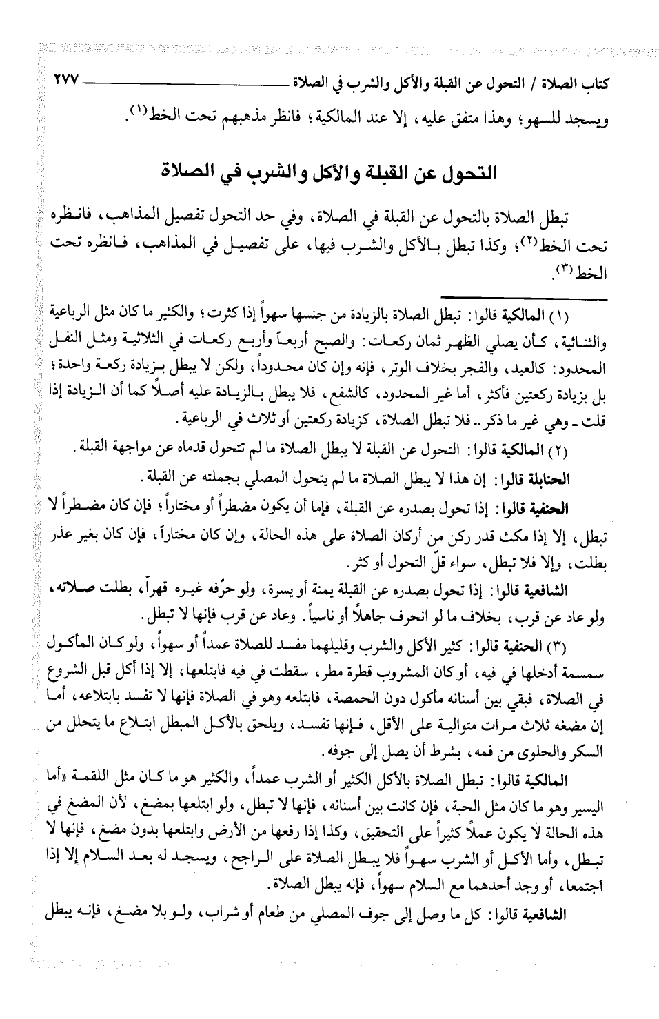 تبطل الصلاة بالتحول عن القبلة في الصلاة، وفي حد التحول تفصيل المذاهب، فانظره تحت الخط (¬2) ؛ وكذا تبطل بالأكل والشرب فيها، على تفصيل في المذاهب، فانظره تحت الخط (¬3) .