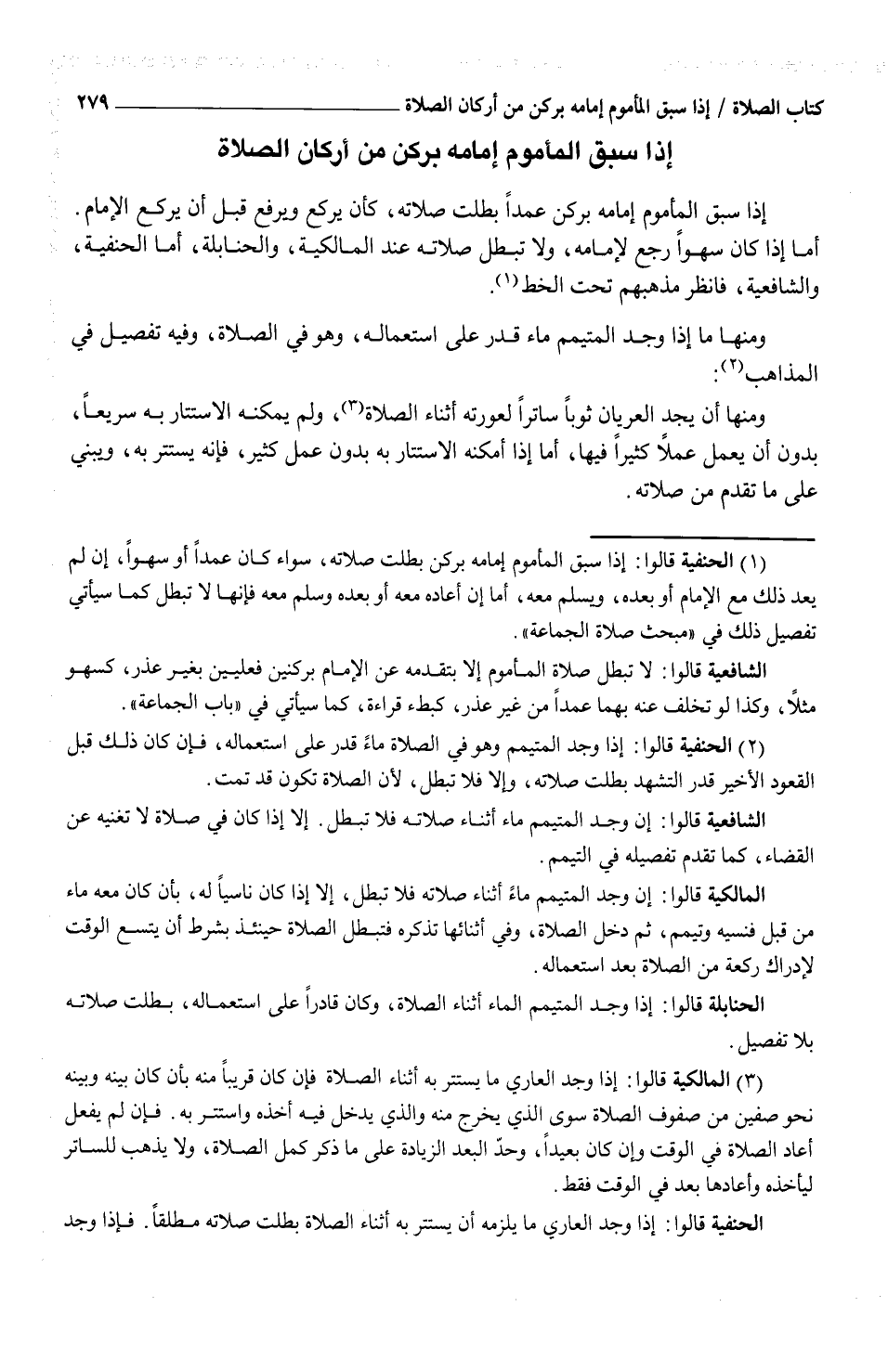 (¬1) الحنفية قالوا: إذا سبق المأموم إمامه بركن بطلت صلاته، سواء كان عمداً أو سهواً، إن لم بعد ذلك مع الإمام أو بعده، ويسلم معه، أما إن أعاده معه أو بعده وسلم معه فإنها لا تبطل كما سيأتي تفصيل ذلك في "مبحث صلاة الجماعة".