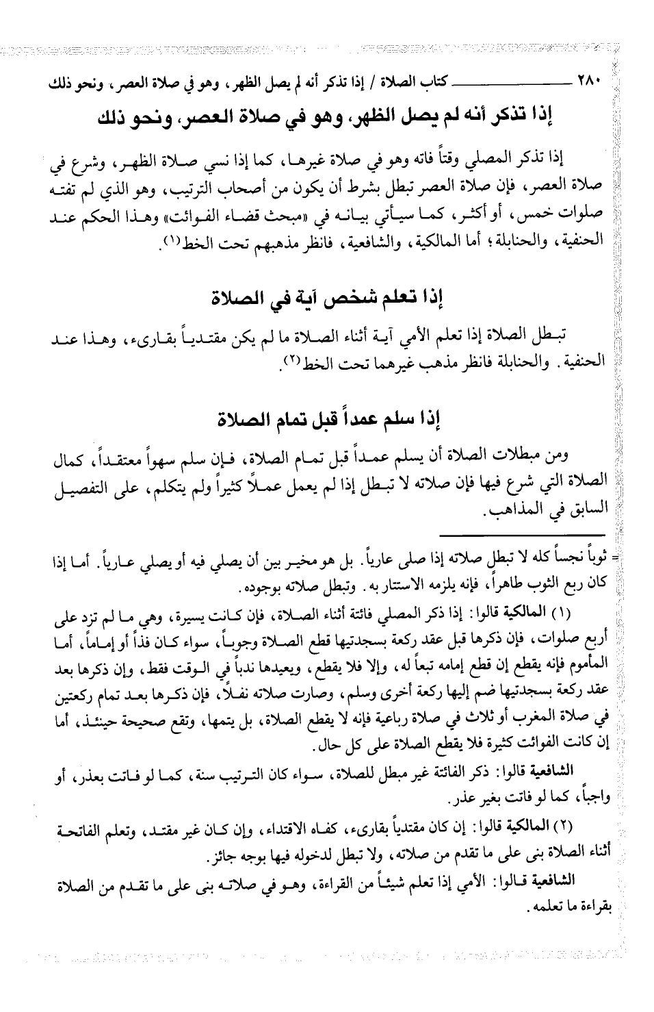 (¬1) المالكية قالوا: إذا ذكر المصلي فائتة أثناء الصلاة، ففإن كانت يسيرة، وهي ما لم تزد على أربع صلوات، فإن ذكرها قبل عقد ركعة بسجدتيها قطع الصلاة وجوباً، سواء كان فذاً أو إماماً، أما المأموم فإنه يقطع إن قطع إمامه تبعاً له، وإلا فلا يقطع، ويعيدها ندباً في الوقت فقط، وإن ذكرها بعد عقد ركعة بسجدتيها ضم إليها ركعة أخرى وسلم، وصارت صلاته نفلاً، فإن ذكرها بعد تمام ركعتين في صلاة المغرب أو ثلاث في صلاة رباعية فإنه لا يقطع الصلاة، بل يتمها، وتقع صحيحة حينئذ، أما إن كانت الفوائت كثيرة فلا يقطع الصلاة على كل حال.