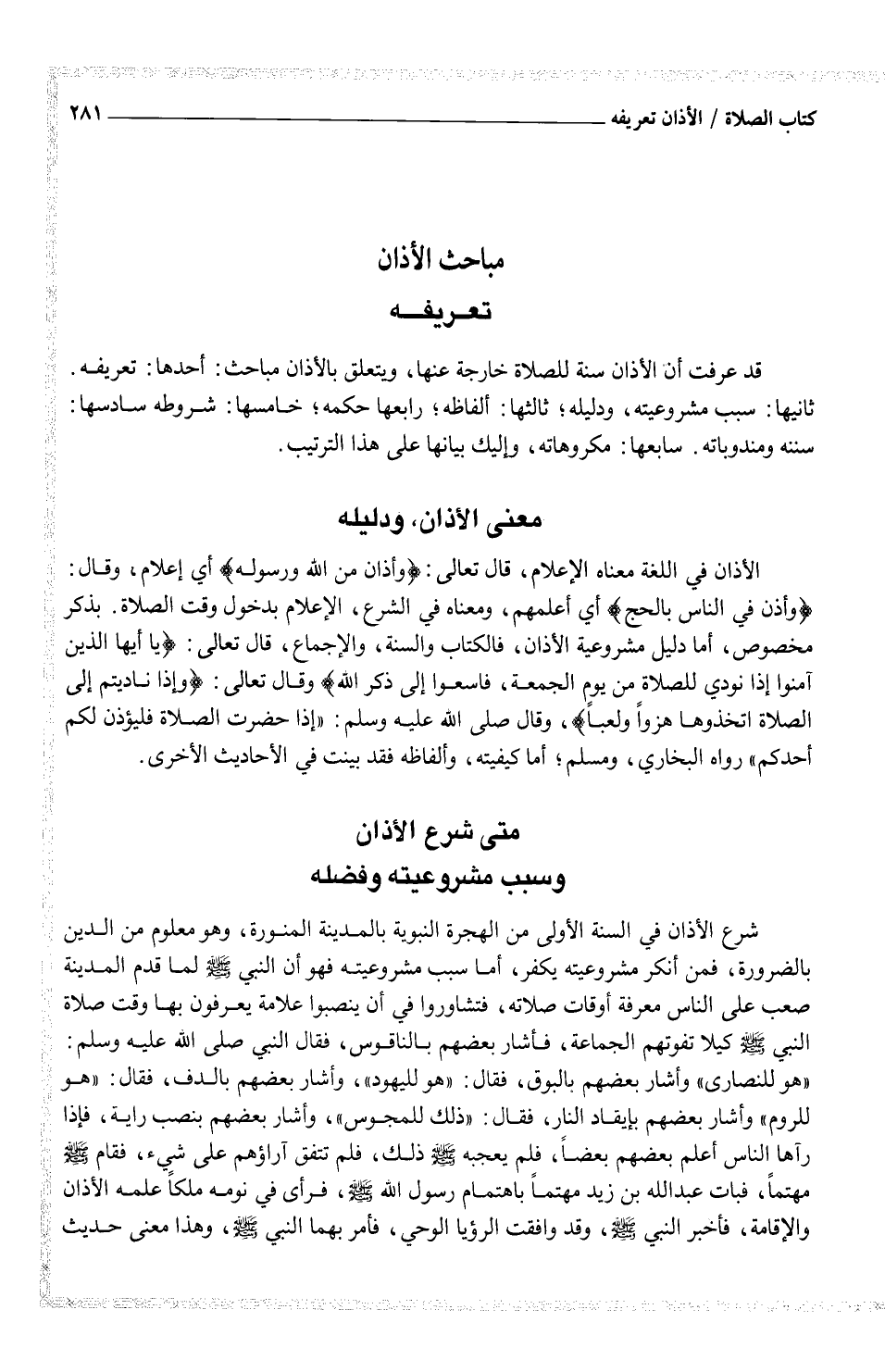 قد عرفت أن الأذان سنة للصلاة خارجة عنها، ويتعلق بالأذان مباحث: أحدها: تعريفه: ثانيها: سبب مشروعيته، ودليله؛ ثالثها: ألفاظه؛ رابعها حكمه؛ خامسها: شروطه سادسها: سننه ومندوباته. سابعها: مكروهاته، وإليك بيانها على هذا الترتيب.