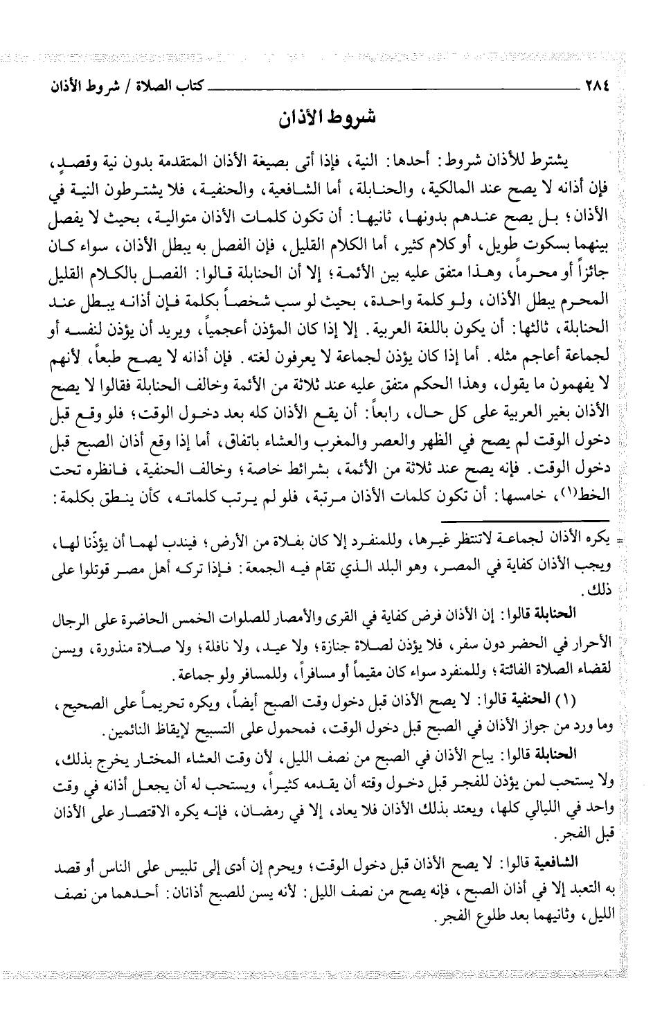 يشترط للأذان شروط: أحدها: النية، فإذا أتى بصيغة الأذان المتقدمة بدون نية وقصدٍ، فإن أذانه لا يصح عند المالكية، والحنابلة، أما الشافعية، والحنفية، فلا يشترطون النية في الأذان؛ بل يصح عندهم بدونها، ثانيها: أن تكون كلمات الأذان متوالية، بحيث لا يفصل بينهما بسكوت طويل، أو كلام كثير، أما الكلام القليل، فإن الفصل به يبطل الأذان، سواء كان جائزاً أو محرماً، وهذا متفق عليه بين الأئمة؛ إلا أن الحنابلة قالوا: الفصل بالكلام القليل المحرم يبطل الأذان، ولو كلمة واحدة، بحيث لو سب شخصاً بكلمة فإن أذانه يبطل عند الحنابلة، ثالثها: أن يكون باللغة العربية. إلا إذا كان المؤذن أعجمياً، ويريد أن يؤذن لنفسه أو لجماعة أعاجم مثله. أما إذا كان يؤذن لجماعة لا يعرفون لغته. فإن أذانه لا يصح طبعاً، لأنهم لا يفهمون ما يقول، وهذا الحكم متفق عليه عند ثلاثة من الأئمة وخالف الحنابلة فقالوا لا يصح الأذان بغير العربية على كل حال، رابعاً: أن يقع الأذان كله بعد دخول الوقت؛ فلو وقع قبل دخول الوقت لم يصح في الظهر والعصر والمغرب والعشاء باتفاق، أما إذا وقع أذان الصبح قبل دخول الوقت. فإنه يصح عند ثلاثة من الأئمة، بشرائط خاصة؛ وخالف الحنفية، فانظره تحت الخط (¬1) ، خامسها: أن تكون كلمات الأذان مرتبة، فلو لم يرتب كلماته، كأن ينطق بكلمة: