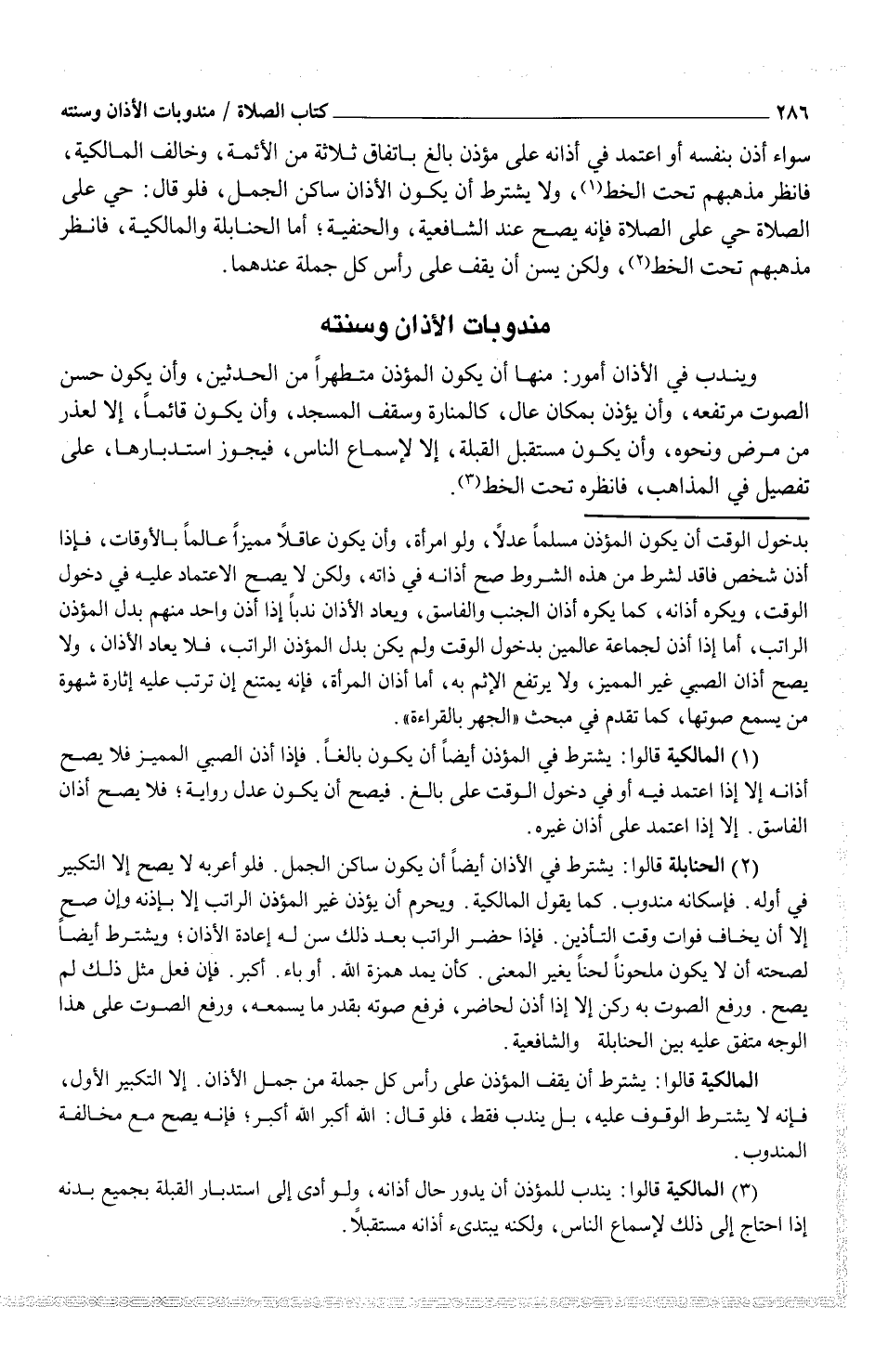 (¬2) الحنابلة قالوا: يشترط في الأذان أيضاً أن يكون ساكن الجمل. فلو أعربه لا يصح إلا التكبير في أوله. فإسكانه مندوب. كما يقول المالكية. ويحرم أن يؤذن غير المؤذن الراتب إلا بإذنه وإن صح إلا أن يخاف فوات وقت التأذين. فإذا حضر الراتب بعد ذلك سن له إعادة الأذان؛ ويشترط أيضاً لصحته أن لا يكون ملحوناً يغير المعنى. كأن يمد همزة الله. أو باء. أكبر. فإن فعل مثل ذلك لم يصح. ورفع الصوت به ركن إلا إذا أذن لحاضر، فرفع صوته بقدر ما يسمعه، ورفع الصوت على هذا الوجه متفق عليه بين الحنابلة والشافعية.
