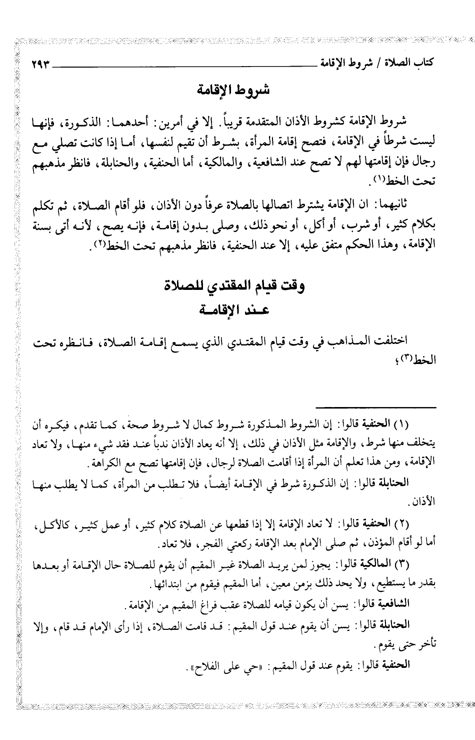 (¬1) الحنفية قالوا: إن الشروط المذكورة شروط كمال لا شروط صحةن كما تقدم، فيكره أن يتخلف منها شرط، والإقامة مثل الأذان في ذلك، إلا أنه يعاد الأذان ندباً عند فقد شيء منها، ولا تعاد الإقامة، ومن هذا تعلم أن المرأة إذا أقامت الصلاة لرجال، فإن إقامتها تصح مع الكراهة.