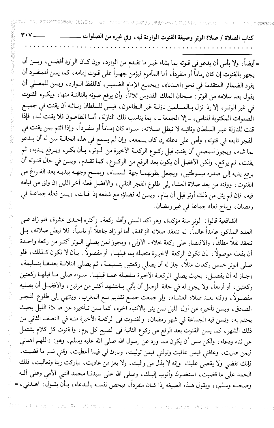 أيضاً، ولا بأس أن يدعو في قنوته بما يشاء غير ما تقدم من الوارد، وإن كان الوارد أفضل، ويسن أن يجهر بالقنوت إن كان إماماً أو منفرداً، أما المأموم فيؤمن جهراً على قنوت إمامه، كما يسن للمنفرد أن يفرد الضمائر المتقدمة في نحو "اهدنا"، ويجمع الإمام الضمير، كاللفظ الوارد، ويسن للمصلي أن يقول بعد سلامه من الوتر: سبحان الملك القدوس ثلاثاً، وأن يرفع صوته بالثالثة منها، ويكره القنوت في غير الوتر، إلا إذا نزل بالمسلمين نازلة غير الطاعون، فيسن للسلطان ونائبه أن يقنت في جميع الصلوات المكتوبة للناس، - إلا الجمعة -، بما يناسب تلك النازلة، أما الطاعون فلا يقنت له، فإذا قنت للنازلة غير السلطان ونائبه لا تبطل صلاته، سواء كان إماماً أو منفرداً، وإذا ائتم بمن يقنت في الفجر تابعه في قنوته، وأمن على دعائه إن كان يسمعه، وإن لم يسمع في هذه الحالة سن له أن يدعو بما شاء، ويجوز للمصلي أن يقنت قبل ركوع الركعة الأخيرة من الوتر، بأن يكبر، ويرفع يديه، ثم يقنت، ثم يركع، ولكن الأفضل أن يكون بعد الرفع من الركوع، كما تقدم، ويسن في حال قنوته أن يرفع يديه إلى صدره مبسوطتين، ويجعل بطونهما جهة السماء، ويمسح وجهه بيديه بعد الفراغ من القنوت، ووقته من بعد صلاة العشاء إلى طلوع الفجر الثاني، والأفضل فعله آخر الليل إن وثق من قيامه فيه، فإن لم