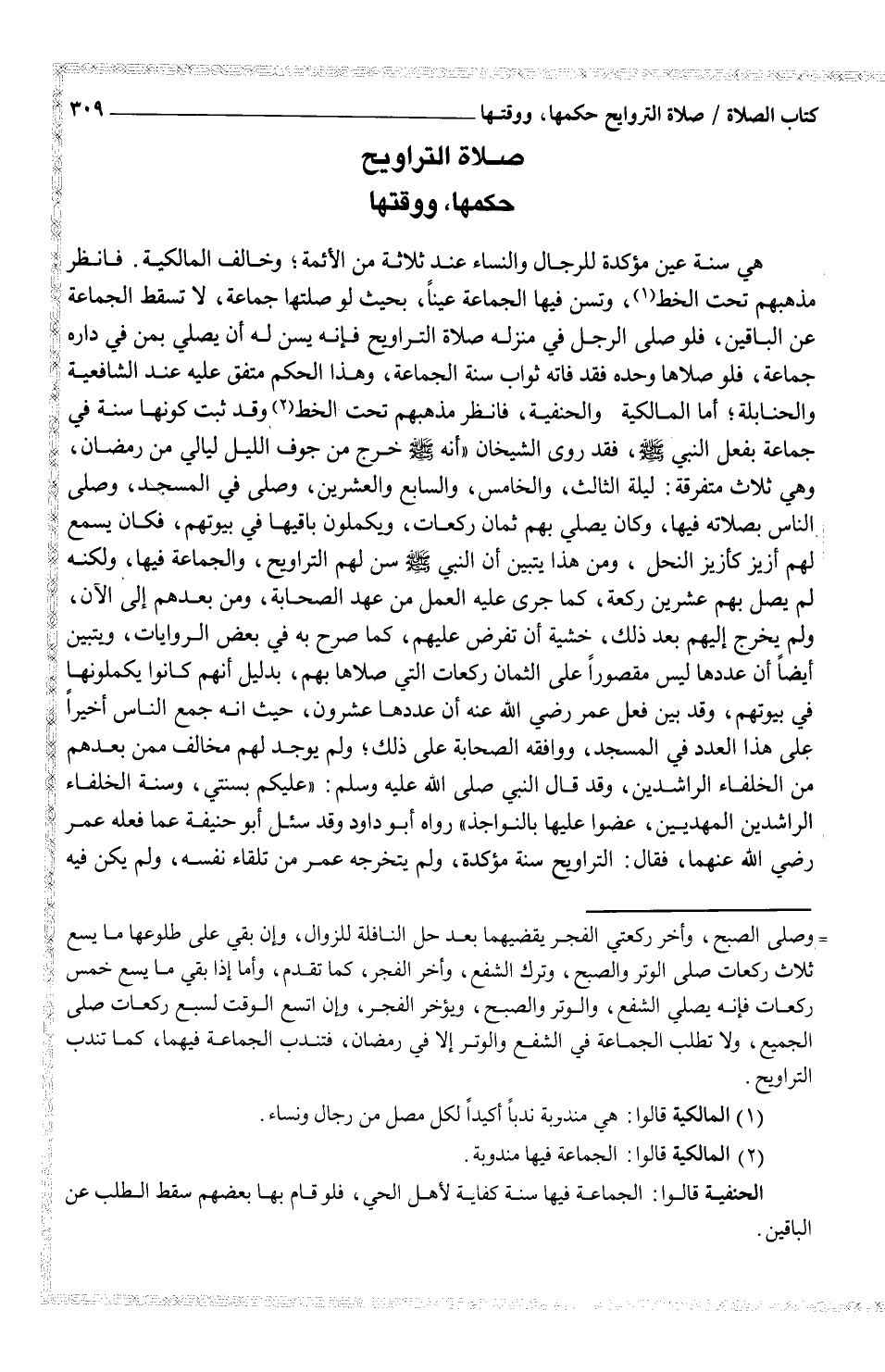 هي سنة عين مؤكدة للرجال والنساء عند ثلاثة من الأئمة؛ وخالف المالكية. فانظر مذهبهم تحت الخط (¬1) ، وتسن فيها الجماعة عيناً، بحيث لو صلتها جماعة، لا تسقط الجماعة عن الباقين، فلو صلى الرجل في منزله صلاة التراويح فإنه يسن له أن يصلي بمن في داره جماعة، فلو صلاها وحده فقد فاته ثواب سنة الجماعة، وهذا الحكم متفق عليه عند الشافعية والحنابلة؛ أما المالكية والحنفية، فانظر مذهبهم تحت الخط (¬2) وقد ثبت كونها سنة في جماعة بفعل النبي صلى الله عليه وسلم، فقد روى الشيخان "أنه صلى الله عليه وسلم خرج من جوف الليل ليالي من رمضا، وهي ثلاث متفرقة: ليلة الثالث، والخامس، والسابع والعشري، وصلى في المسجد، وصلى الناس بصلاته فيها، كان يصلي بهم ثمان ركعات، ويكملون باقيها في بيوتهم، فكان يسمع له أزيز كأزيز النحل، ومن هذا يتبين أن النبي صلى الله عليه وسلم سن لهم التراويح، والجماعة فيها، ولكنه لم يصل بهم عشرين ركعة، كما جرى عليه العمل من عهد الصحابة، ومن بعدهم إلى الآنن ولم يخرج إليهم بعد ذلك، خشية أن تفرض عليهم، كما صرح به في بعض الروايات، ويتبين أيضاً أن عددها ليس مقصوراً على الثمان ركعات التي صلاها بهم، بدليل أنهم كانوا يكملونها في بيوتهم، وقد بين فعل عمر رضي الله عنه أن عددها عشرون، حيث أنه جمع الناس أخيراً على هذا العدد في المسجد، ووافقه الصحابة على ذلك؛ ولم يوجد لهم مخالف ممن بعدهم من الخلفاء الراشدين، وقد قال النبي صلى الله عليه وسلم: "عليكم بسنتي، وسنة الخلفاء الراشدين المهديين، عضوا عليها بالنواجذ" رواه أبو داود وقد سئل أو حنيفة عما فعله عمر رضي الله عنهما، فقال التراويح سنة مؤكدة، ولم يتخرجه عمر من تلقاء نفسه، ولم يكن فيه