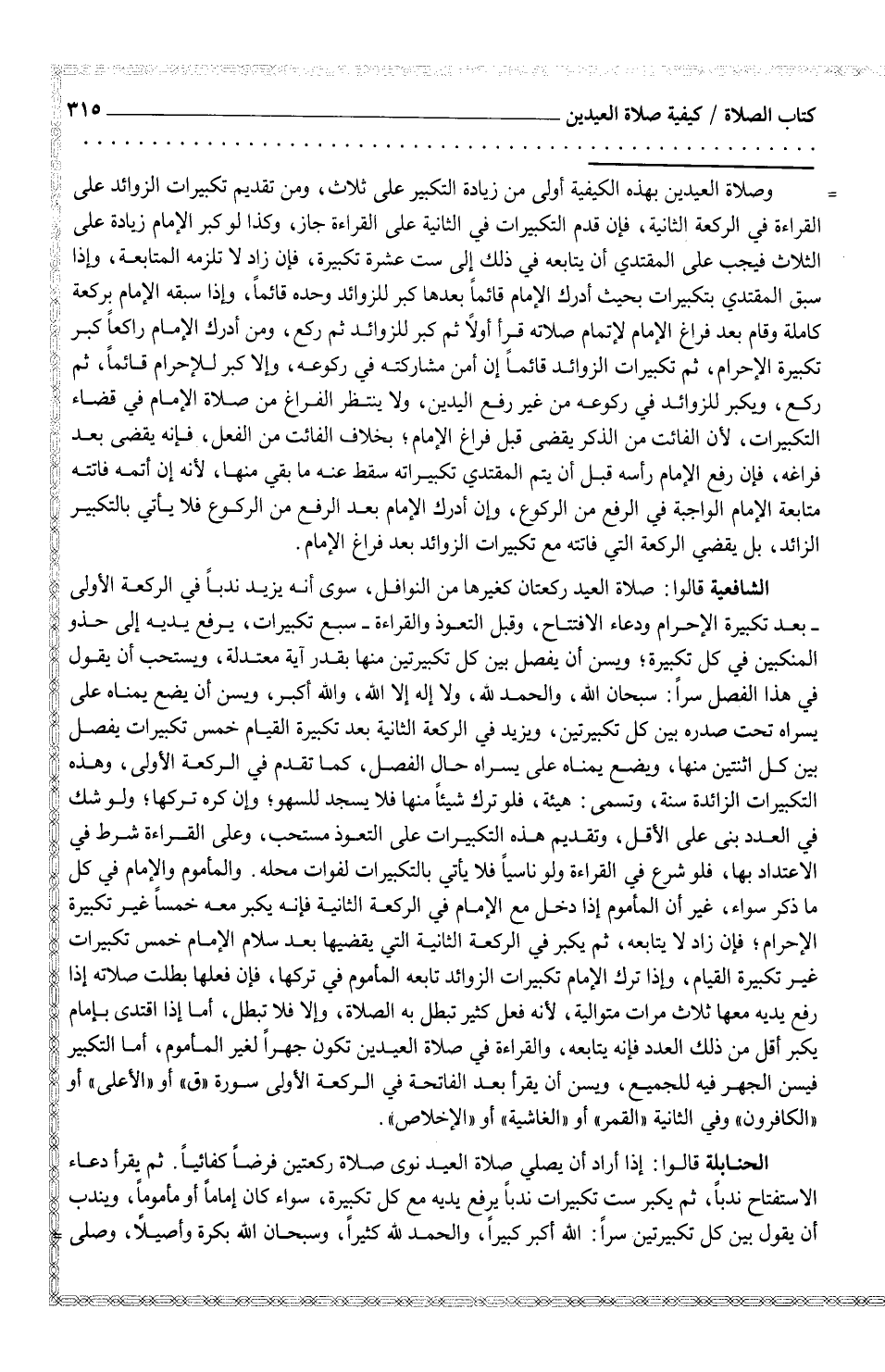 وصلاة العيدين بهذه الكيفية أولى من زيادة التكبير على ثلاث، ومن تقديم تكبيرات الزوائد على القراءة في الركعة الثانية، فإن قدم التكبيرات في الثانية على القراءة جاز، وكذا لو كبر الإمام زيادة على الثلاث فيجب على المقتدي أن يتابعه في ذلك إلى ست عشرة تكبيرة، فإن زاد لا تلزمه المتابعة، وإذا سبق المقتدي بتكبيرات بحيث أدرك الإمام قائماً بعدها كبر للزوائد وحده قائماً، وإذا سبقه الإمام بركعة كاملة وقام بعد فراغ الإمام لإتمام صلاته قرأ أولاً ثم كبر للزوائد ثم ركع، ومن أدرك الإمام راكعاً كبر تكبيرة الإحرام، ثم تكبيرات الزوائد قائماً إن أمن مشاركته في ركوعه، وإلا كبر للإحرام قائماً، ثم ركع، ويكبر للزوائد في ركوعه من غير رفع اليدين، ولا ينتظر الفراغ من صلاة الإمام في قضاء التكبيرات، لأن الفائت من الذكر يقضى قبل فراغ الإمام؛ بخلاف الفائت من الفعل، فإنه يقضى بعد فراغه، فإن رفع الإمام رأسه قبل أن يتم المقتدي تكبيراته سقط عنه ما بقي منها، لأنه إن أتمه فاتته متابعة الإمام الواجبة في الرفع من الركوع، وإن أدرك الإمام بعد الرفع من الركوع فلا يأتي بالتكبير الزائد، بل يقضي الركعة التي فاتته مع تكبيرات الزوائد بعد فراغ الإمام.