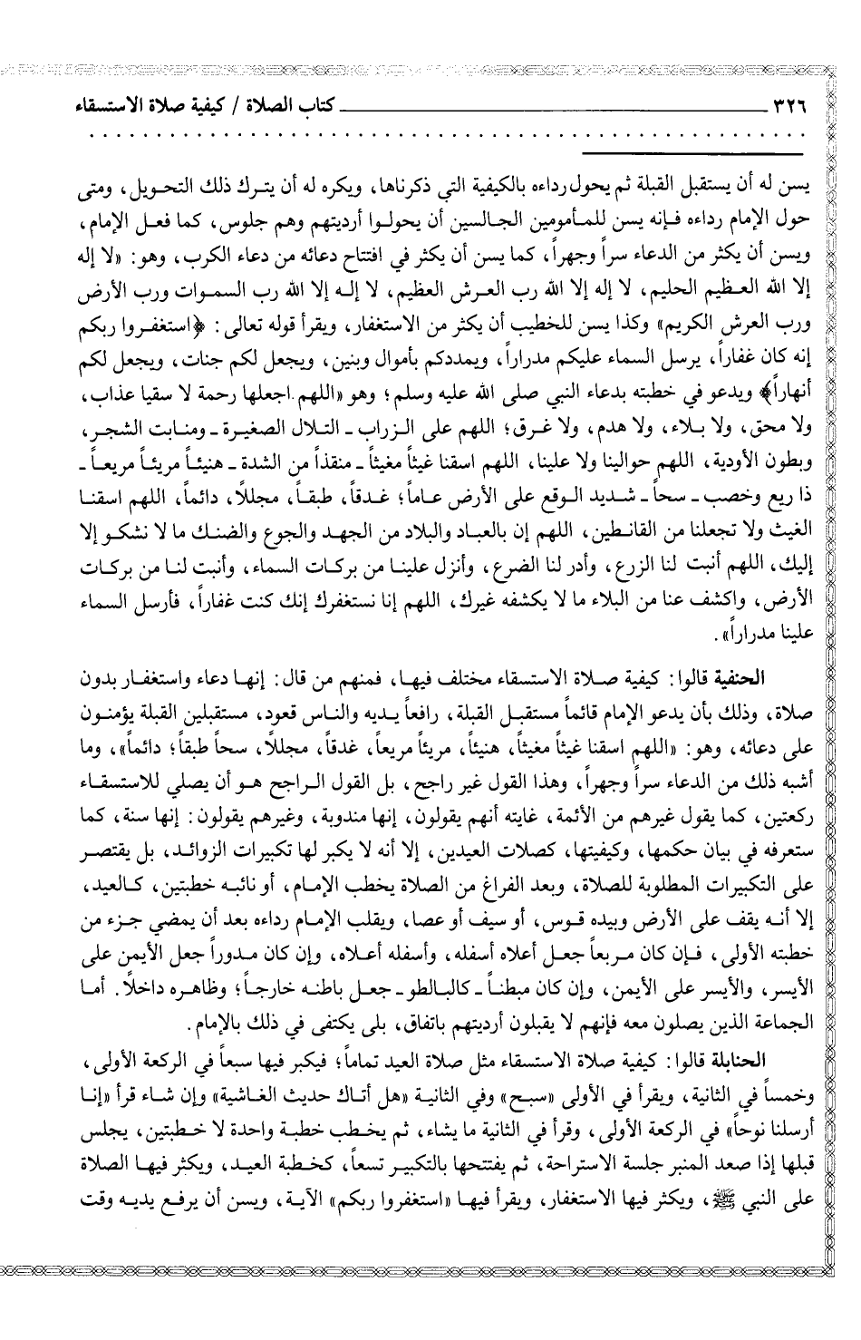 الحنفية قالوا: كيفية صلاة الاستسقاء مختلف فيها، فمنهم من قال: إنها دعاء واستغفار بدون صلاة، وذلك بأن يدعو الإمام قائماً مستقبل القبلة، رافعاً يديه والناس قعود، مستقبلين القبلة يؤمنون على دعائه، وهو: "اللهم اسقنا غيثاً مغيثاً، هنيئاً، مريئاً مريعاً، غدقاً، مجللاً، سحاً طبقاً؛ دائماً"، وما أشبه ذلك من الدعاء سراً وجهراً، وهذا القول غير راجح، بل القول الراجح هو أن يصلي للاستسقاء ركعتين، كما يقول غيرهم من الأئمة، غايته أنهم يقولون، إنها مندوبة، وغيرهم يقولون: إنها سنة، كما ستعرفه في بيان حكمها، وكيفيتها، كصلات العيدين، إلا أنه لا يكبر لها تكبيرات الزوائد، بل يقتصر على التكبيرات المطلوبة للصلاة، وبعد الفراغ من الصلاة يخطب الإمام، أو نائبه خطبتين، كالعيد، إلا أنه يقف على الأرض وبيده قوس، أو سيف أو عصا، ويقلب الإمام رداءه بعد أن يمضي جزء من خطبته الأولى، فإن كان مربعاً جعل أعلاه أسفله، وأسفله أعلاه، وإن كان مدوراً جعل الأيمن على الأيسر، والأيسر على الأيمن، وإن كان مبطناً - كالبالطو - جعل باطنه خارجاً؛ وظاهره داخلاً. أما الجماعة الذين يصلون معه فإنهم لا يقبلون أرديتهم باتفاق، بلى يكتفي في ذلك بالإمام.