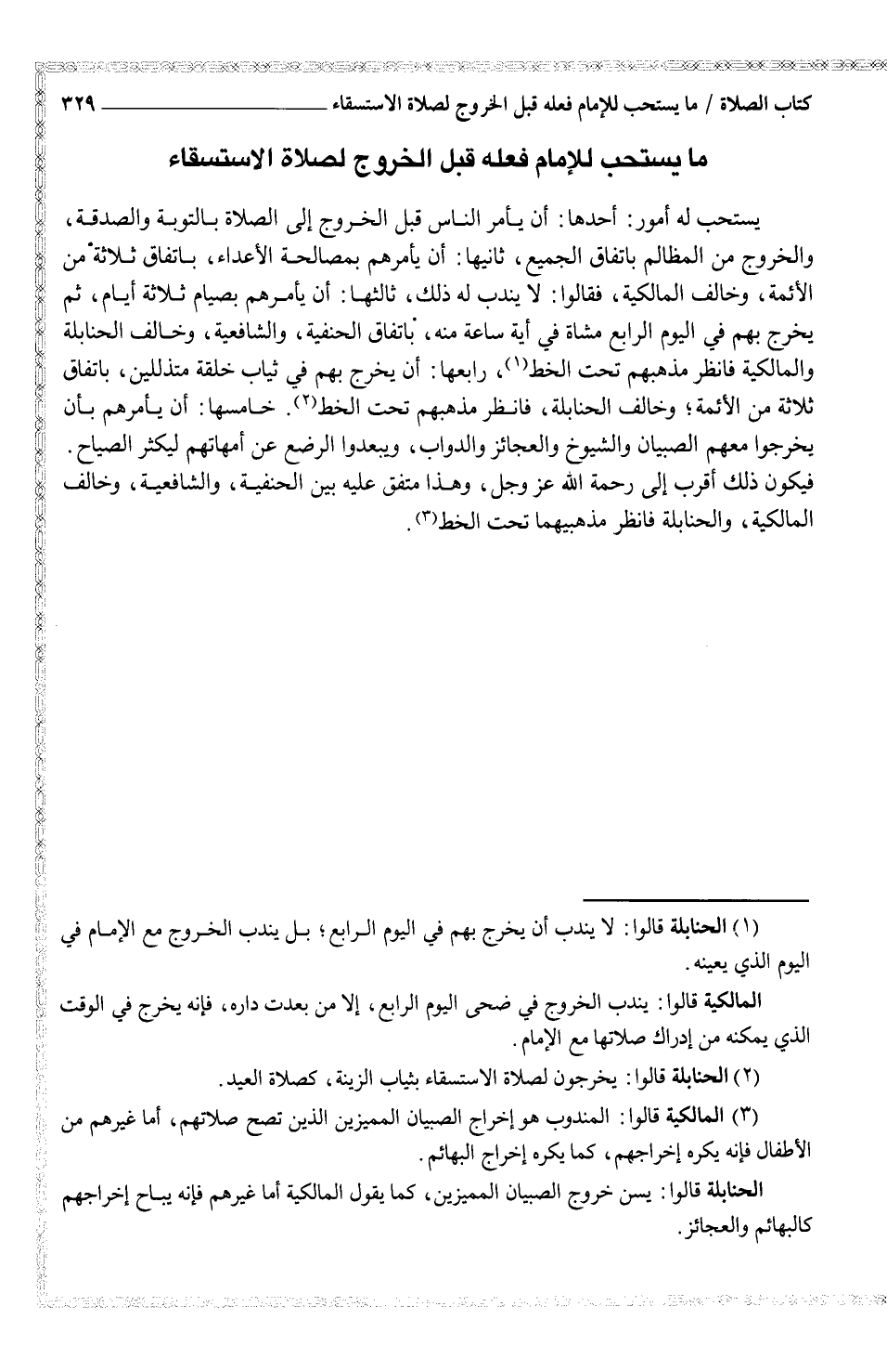 يستحب له أمور: أحدها: أن يأمر الناس قبل الخروج إلى الصلاة بالتوبة والصدقة، والخروج من المظالم باتفاق الجميع، ثانيها: أن يأمرهم بمصالحة الأعداء، باتفاق ثلاثة من الأئمة، وخالف المالكية، فقالوا: لا يندب له ذلك، ثالثها: أن يأمرهم بصيام ثلاثة أيام، ثم يخرج بهم في اليوم الرابع مشاة في أية ساعة منه، باتفاق الحنفية، والشافعية، وخالف الحنابلة والمالكية فانظر مذهبهم تحت الخط (¬1) ، رابعها: أن يخرج بهم في ثياب خلقة متذللين، باتفاق ثلاثة من الأئمة؛ وخالف الحنابلة، فانظر مذهبهم تحت الخط (¬2) . خامسها: أن يأمرهم بأن يخرجوا معهم الصبيان والشيوخ والعجائز والدواب، ويبعدوا الرضع عن أمهاتهم ليكثر الصياح. فيكون ذلك أقرب إلى رحمة الله عز وجل، وهذا متفق عليه بين الحنفية، والشافعية، وخالف المالكية، والحنابلة فانظر مذهبيهما تحت الخط (¬3) .