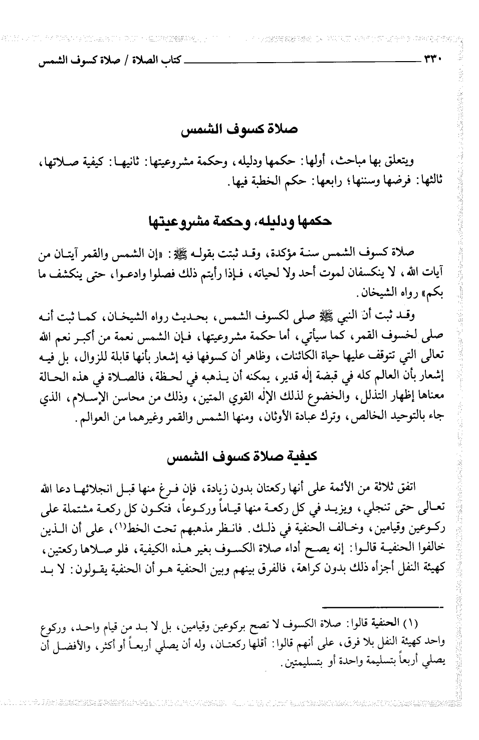 (¬1) الحنفية قالوا: صلاة الكسوف لا تصح بركوعين وقيامين، بل لا بد من قيام واحد، وركوع واحد كهيئة النفل بلا فرق، على أنهم قالوا: أقلها ركعتان، وله أن يصلي أربعاً أو أكثر، والأفضل أن يصلي أربعاً بتسليمة واحدة أو بتسليمتين