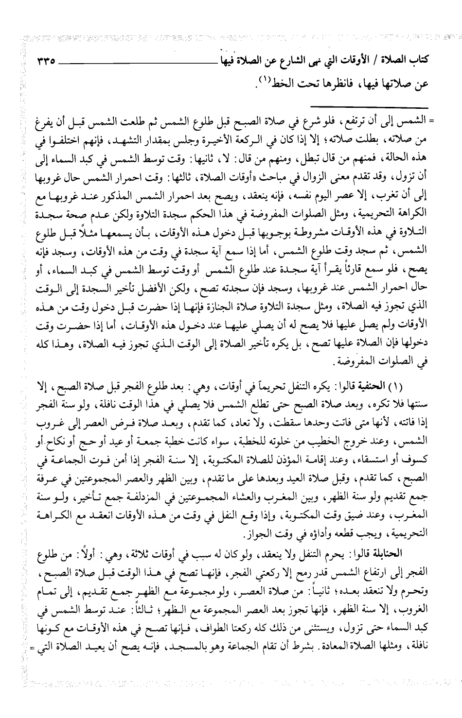(¬1) الحنفية قالوا: يكره التنفل تحريماً في أوقات، وهي: بعد طلوع الفجر قبل صلاة الصبح، إلا سنتها فلا تكره، وبعد صلاة الصبح حتى تطلع الشمس فلا يصلي في هذا الوقت نافلة، ولو سنة الفجر إذا فاتته، لأنها متى فاتت وحدها سقطت، ولا تعاد، كما تقدم، وبعد صلاة فرض العصر إلى غروب الشمس، وعند خروج الخطيب من خلوته للخطبة، سواء كانت خطبة جمعة أو عيد أو حج أو نكاح أو كسوف أو استسقاء، وعند إقامة المؤذن للصلاة المكتوبة، إلا سنة الفجر إذا أمن فوت الجماعة في الصبح، كما تقدم، وقبل صلاة العيد وبعدها على ما تقدم، وبين الظهر والعصر المجموعتين في عرفة جمع تقديم ولو سنة الظهر، وبين المغرب والعشاء المجموعتين في المزدلفة جمع تأخير، ولو سنة المغرب، وعند ضيق وقت المكتوبة، وإذا وقع النفل في وقت من هذه الأوقات انعقد مع الكراهة التحريميةن ويجب قطعه وأداؤه في وقت الجواز.