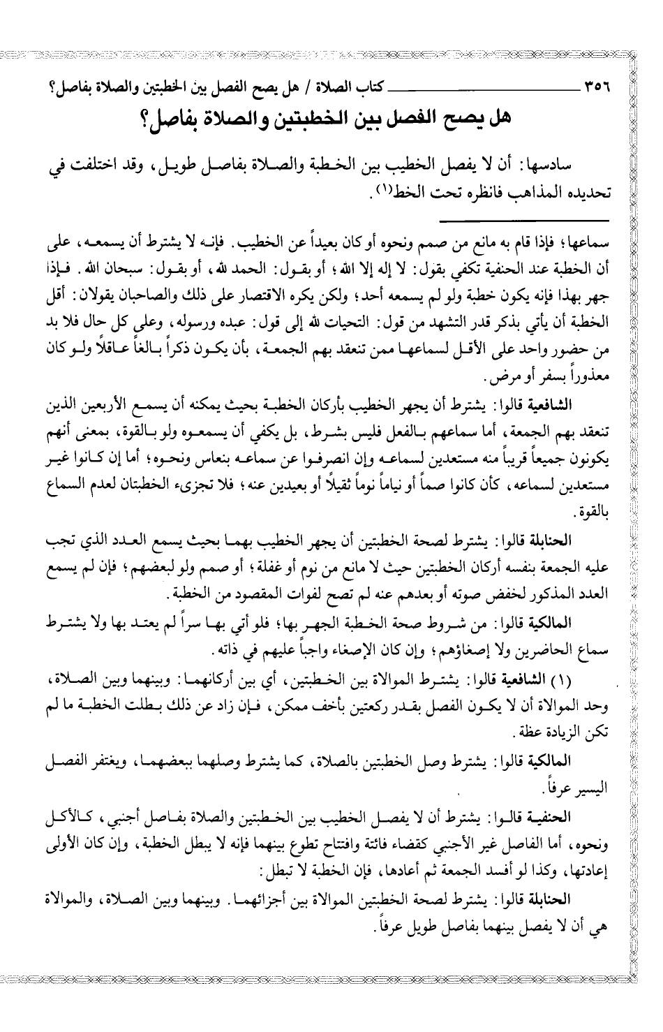 (¬1) الشافعية قالوا: يشترط الموالاة بين الخطبتين، أي بين أركانهما: وبينهما وبين الصلاة، وحد الموالاة أن لا يكون الفصل بقدر ركعتين بأخف ممكن، فإذا زاد عن ذلكك بطلت الخطبة ما لم تكن الزيادة عظة.