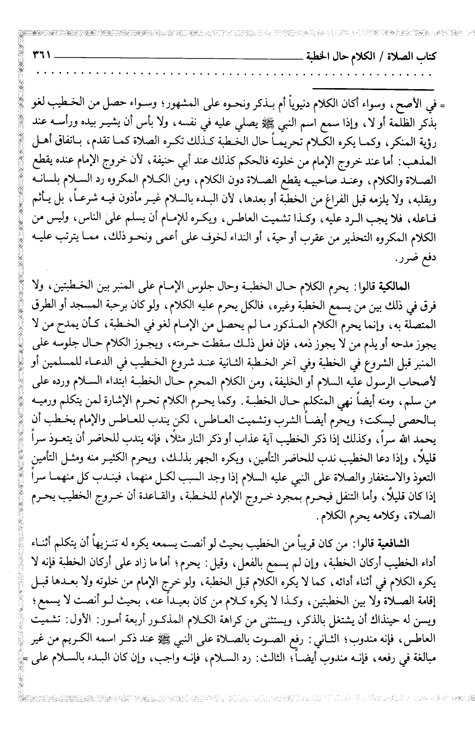 المالكية قالوا: يحرم الكلام حال الخطبة وحال جلوس الإمام على المنبر بين الخطبتين، ولا فرق في ذلك بين من يسمع الخطبة وغيره، فالكل يحرم عليه الكلام، ولو كان برحبة المسجد أو الطرق المتصلة به، وإنما يحرم الكلام المذكور ما لم يحصل من الإمام لغو في الخطبة، كأن يمدح من لا يجوز مدحه أو يذم من لا يجوز ذمه، فإن فعل ذلك سقطت حرمته، ويجوز الكلام حال جلوسه على المنبر قبل الشروع في الخطبة وفي آخر الخطبة الثانية عند شروع الخطيب في الدعاء للمسلمين أو لأصحاب الرسول عليه السلام أو الخليفة، ومن الكلام المحرم حال الخطبة ابتداء السلام ورده على من سلم، ومنه أيضاً نهي المتكلم حال الخطبة. وكما يحرم الكلام تحرم الإشارة لمن يتكلم ورميه بالحصى ليسكت؛ ويحرم أيضاً الشرب وتشميت العاكس، لكن يندب للعاطس والإمام يخطب أن يحمد الله سراً، وكذلك إذا ذكر الخطيب آية عذاب أو ذكر النار مثلاً، فإنه يندب للحاضر أن يتعوذ سراً قليلاً، وإذا دعا الخطيب ندب للحاضر التأمين، ويكره الجهر بذلك، ويحرم الكثير منه ومثل التأمين التعوذ والاستغفار والصلاة على النبي عليه السلام إذا وجد السبب لكل منهما، فيندب كل منهما سراً إذا كان قليلاً، وأما التنفل فيحرم بمجرد خروج الإمام للخطبة، والقاعدة أن خروج الخطيب يحرم الصلاة، وكلامه يحرم الكلام.