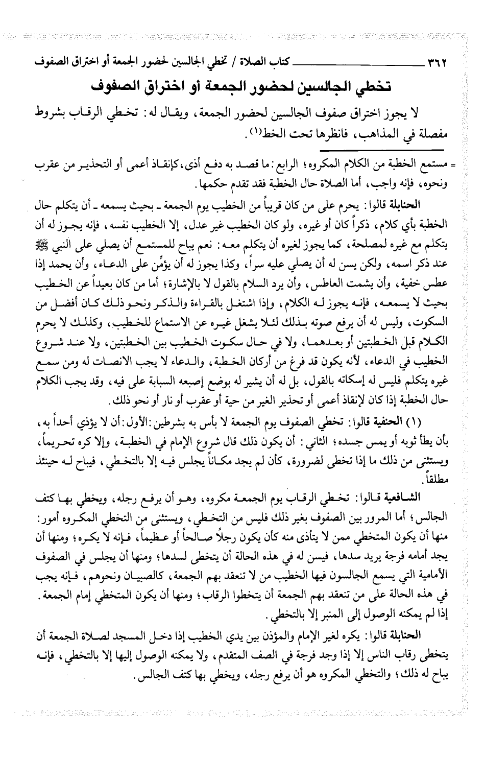 (¬1) الحنفية قالوا: تخطي الصفوف يوم الجمعة لا بأس به بشرطين: الأول: أن لا يؤذي أحداً به، بأن يطأ ثوبه أو يمس جسده؛ الثاني: أن يكون ذلك قال شروع الإمام في الخطبة، وإلا كره تحريماً، ويستثنى من ذلك ما إذا تخطى لضرورة، كأن لم يجد مكاناً يجلس فيه إلا بالتخطي، فيباح له حينئذ مطلقاً.