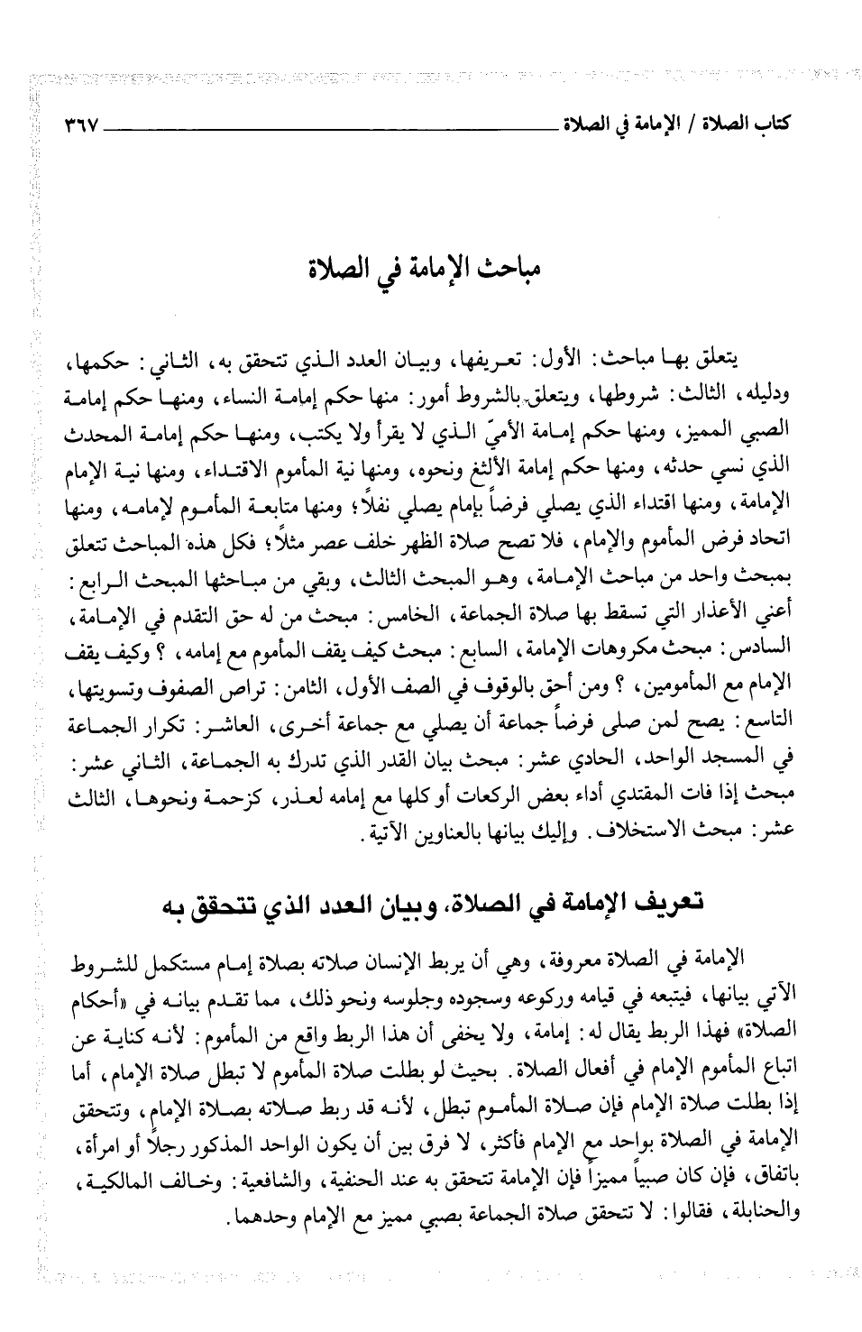 يتعلق بها مباحث: الأول: تعريفها، وبيان العدد الذي تتحقق به، الثاني: حكمها، ودليله، الثالث: شروطها، ويتعلق بالشروط أمور: منها حكم إمامة النساء، ومنها حكم إمامه الصبي المميز، ومنها حكم إمامة الأميّ الذي لا يقرأ ولا يكتب، ومنها حكم إمامة المحدث الذي نسي حدثه، ومنها حكم إمامة الألثغ ونحوه، ومنها نية المأموم الاقتداء، ومنها نية الإمام الإمامة، ومنها اقتداء الذي يصلي فرضاً بإمام يصلي نفلاً؛ ومنها متابعة المأموم لإمامه، ومنها اتحاد فرض المأموم والإمام، فلا تصح صلاة الظهر خلف عصر مثلاً؛ فكل هذه المباحث تتعلق بمبحث واحد من مباحث الإمامة، وهو المبحث الثالث، وبقي من مباحثها المبحث الرابع: أعني الأعذار التي تسقط بها صلاة الجماعة، الخامس: مبحث من له حَق التقدم في الإمامة، السادس: مبحث مكروهات الإمامة، السابع: مبحث كيف يقف المأموم مع إمامه،؟ وكيف يقف الإمام مع المأمومين،؟ ومن أحق بالوقوف في الصف الأول، الثامن: تراص الصفوف وتسويتها، التاسع: يصح لمن صلى فرضاً جماعة أن يصلي مع جماعة أخرى، العاشر: تكرار الجماعة في المسجد الواحد، الحادي عشر: مبحث بيان القدر الذي تدرك به الجماعة، الثاني عشر: مبحث إذا فات المقتدي أداء بعض الركعات أو كلها مع إمامه لعذر، كزحمة ونحوها، الثالث عشر: مبحث الاستخلاف. وإليك بيانها بالعناوين الآتية.