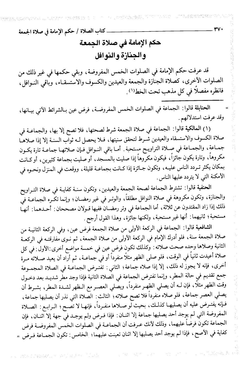 قد عرفت حكم الإمامة في الصلوات الخمس المفروضة، وبقي حكمها في غير ذلك من الصلوات الأخرى، كصلاة الجنازة والجمعة والعيدين والكسوف والاستسقاء، وباقي النوافل، فانظره مفصلاً في كل مذهب تحت الخط (¬1) .
