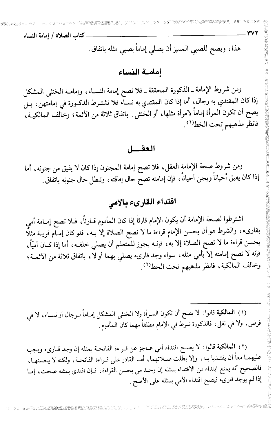 ومن شروط الإمامة - الذكورة المحققة - فلا تصح إمامة النساء، وإمامة الخنثى المشكل إذا كان المقتدي به رجال، أما إذا كان المقتدي به نساء فلا تشترط الذكورة في إمامتهن، بل يصح أن تكون المرأة إماماً لا مرأة مثلها، أو الخنثى. باتفاق ثلاثة من الأئمة؛ وخالف المالكية، فانظر مذهبهم تحت الخط (¬1) .