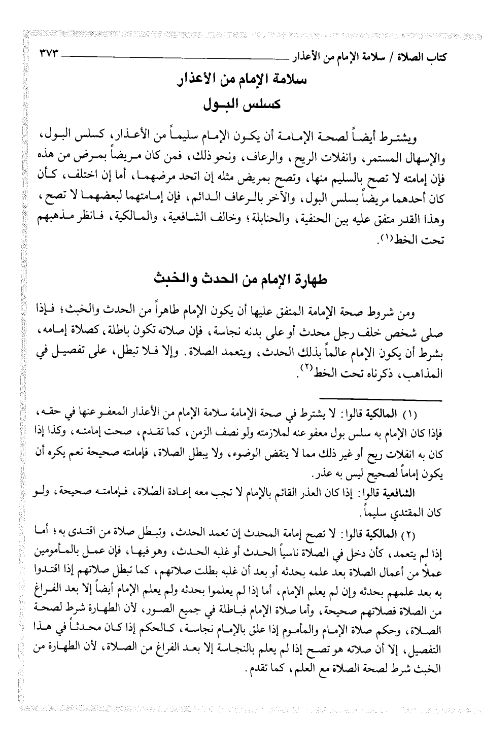 ويشترط أيضاً لصحة الإمامة أن يكون الإمام سليماً من الأعذار، كسلس البول، والإسهال المستمر، وانفلات الريح، والرعاف، ونحو ذلك، فمن كان مريضاً بمرض من هذه فإن إمامته لا تصح بالسليم منها، وتصح بمريض مثله إن اتحد مرضهما، أما إن اختلف، كأن كان أحدهما مريضاً بسلس البول، والآخر بالرعاف الدائم، فإن إمامتهما لبعضهما لا تصح، وهذا القدر متفق عليه بين الحنفية، والحنابلة؛ وخالف الشافعية، والمالكية، فانظر مذهبهم تحت الخط (¬1) .