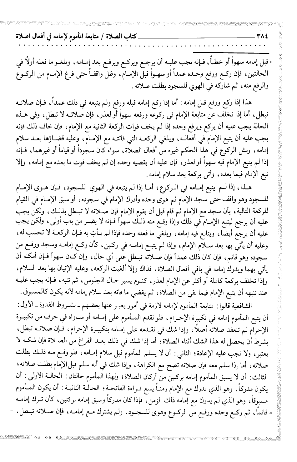 الشافعية قالوا: متابعة المأموم لإمامه لازمة في أمور يعبر عنها بعضهم - بشروط القدوة - الأول: أن يتبع المأموم إمامه في تكبيرة الإحرام، فلو تقدم المأموم على إمامه أو ساواه في حرف من تكبيرة الإحرام لم تنعقد صلاته أصلاً، وإذا شك في تقدمه على إمامه بتكبيرة الإحرام، فإن صلاته تبطل، بشرط أن يحصل له هذا الشك أثناء الصلاة؛ أما إذا شك في ذلك بعد الفراغ من الصلاة فإن شكه لا يعتبر، ولا تجب عليه الإعادة، الثاني: ان لا يسلم المأموم قبل سلام إمامه، فلو وقع منه ذلك بطلت صلاته، أما إذا سلم معه فإن صلاته تصح مع الكراهة، وإذا شك في أنه سلم قبل الإمام بطلت صلاته؛ الثالث: أن لا يسبق المأموم إمامه ركنين من أركان الصلاة؛ ولهذا المأموم حالتان: أن يكون المأموم مسبوقاً، وهو الذي لم يدرك مع إمامه ذلك الزمن، فإذا كان مدركاً وسبق إمامه بركنين، كأن ترك إمامه قائماً، ثم ركع وحده ورفع من الركوع وهوى للسجود، ولم يشترك مع إمامه، فإن صلاته تبطل،