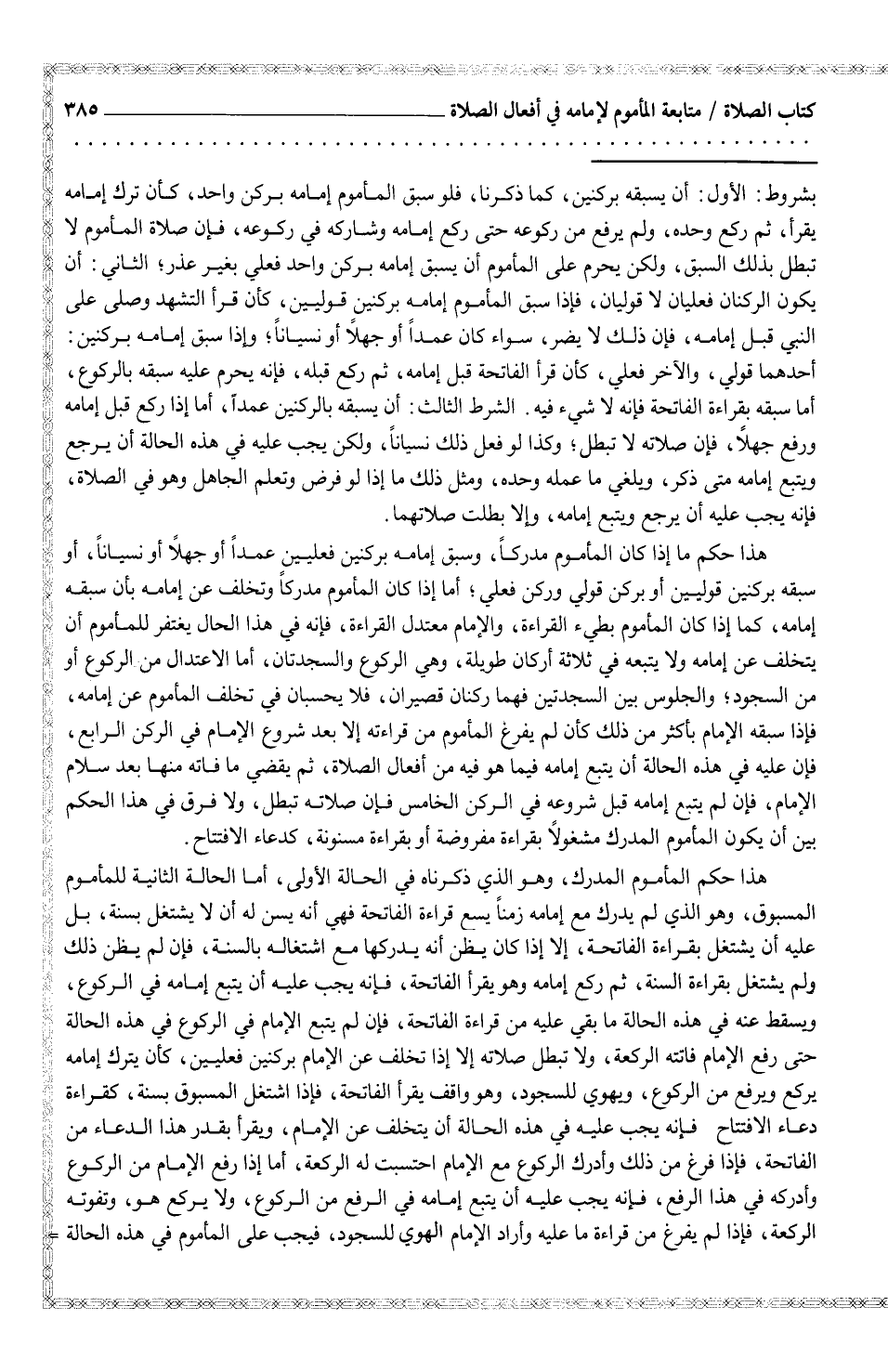 هذا حكم المأموم المدرك، وهو الذي ذكرناه في الحالة الأولى، أما الحالة الثانية للمأموم المسبوق، وهو الذي لم يدرك مع إمامه زمناً يسع قراءة الفاتحة فهي أنه يسن له أن لا يشتغل بسنة، بل عليه أن يشتغل بقراءة السنة، ثم ركع إمامه وهو يقرأ الفاتحة، فإنه يجب عليه أن يتبع إمامه في الركوع، ويسقط عنه في هذه الحالة ما بقي عليه من قراءة الفاتحة، فإن لم يتبع الإمام في الركوع في هذه الحالة حتى رفع الإمام فاتته الركعة، ولا تبطل صلاته إلا إذا تخلف عن الإمام بركنين فعليين، كأن يترك إمامه يركع ويرفع من الركوع، ويهوي للسجود، وهو واقف يقرأ الفاتحة، فإذا اشتغل المسبوق بسنة، كقراءة دعاء الافتتاح فإنه يجب عليه في هذه الحالة أن يتخلف عن الإمام، ويقرأ بقدر هذا الدعاء من الفاتحة، فإذا فرغ من ذلك وأدرك الركوع مع الإمام احتسبت له الركعة، أما إذا رفع الإمام من الركوع وأدركه في هذا الرفع، فإنه يجب عليه أن يتبع إمامه في الرفع من الركوع، ولا يركع هو، وتفوته الركعة، فإذا لم يفرغ من قراءة ما عليه وأراد الإمام الهوي للسجود، فيجب على المأموم في هذه الحالة