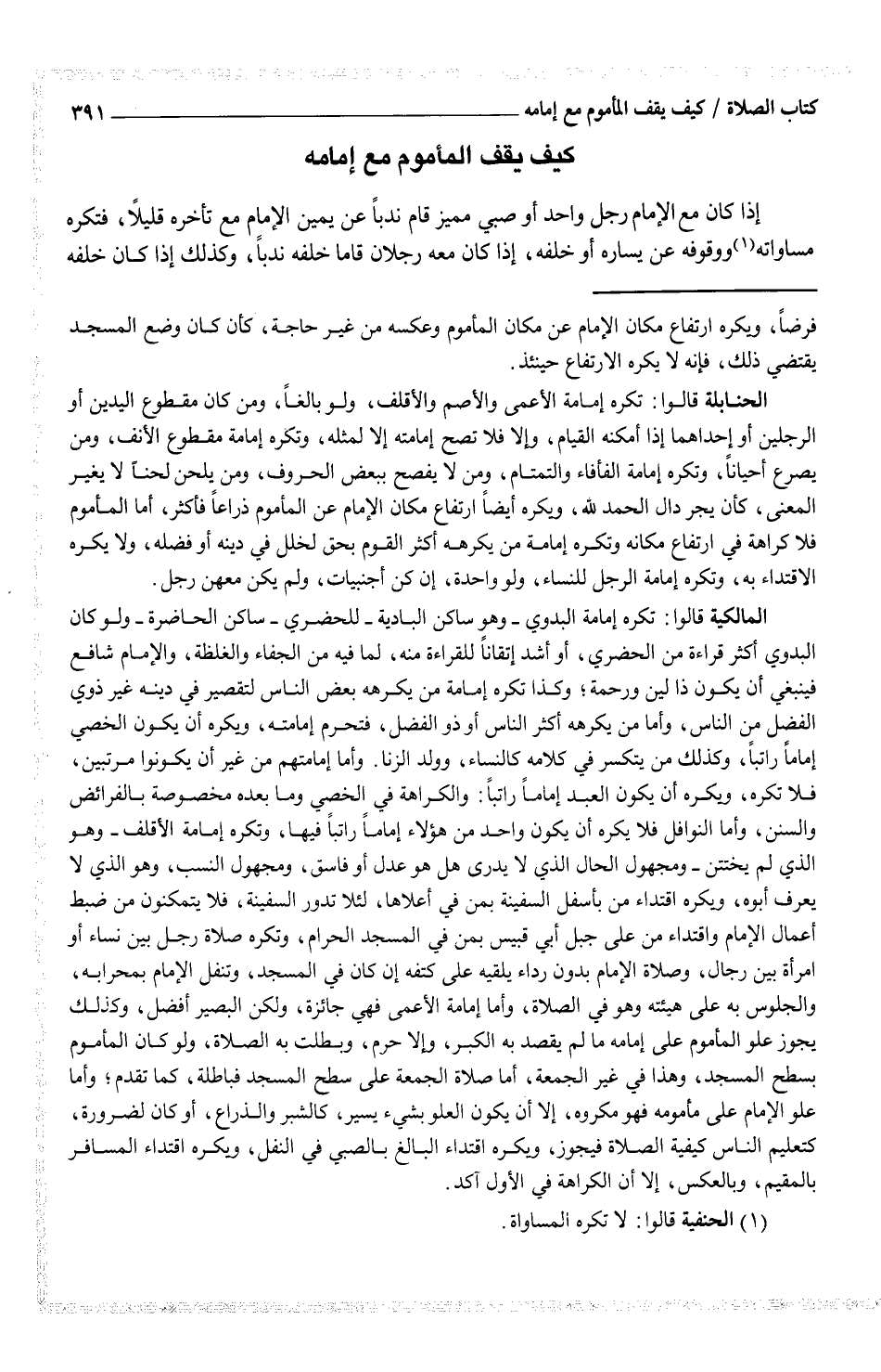 وأما إمامتهم من غير أن يكونوا مرتبين، فلا تكره، ويكره أن يكون العبد إماماً راتباً: والكراهة في الخصي وما بعده مخصوصة بالفرائض والسنن، وأما النوافل فلا يكره أن يكون واحد من هؤلاء إماماً راتباً فيها، وتكره إمامة الأقلف - وهو الذي لم يختن - ومجهول الحال الذي لا يدري هل هو عدل أو فاسق، ومجهول النسب، وهو الذي لا يعرف أبوه، ويكره اقتداء من بأسفل السفينة بمن في أعلاها، لئلا تدور السفينة، فلا يتمكنون من ضبط أعمال الإمام واقتداء من عل جبل أبي قبيس بمن في المسجد الحرام، وتكره صلاة رجل بين نساء أو امرأة بين رجال، وصلاة الإمام بدون رداء يلقيه على كتفه إن كان في المسجد، وتنفل الإمام بمحرابه، والجلوس به على هيئته وهو في الصلاة، وأما إمامة الأعمى فهو جائزة، ولكن البصير أفضل، وكذلك يجوز علو المأموم على إمامه ما لم يقصد به الكبر، وإلا حرم، وبطلت به الصلاة، ولو كان المأموم بسطح المسجد، وهذا في غير الجمعة، أما صلاة الجمعة على سطح المسجد فباطلة، كما تقدم؛ وأما علو الإمام على مأمومه فهو مكروه، إلا أن يكون العلو بشيء يسير، كالشبر والذراع، أو كان لضرورة، كتعليم الناس كيفية الصلاة فيجوز، ويكره اقتداء البالغ بالصبي في النفل، ويكره اقتداء المسافر بالمقيم وبالعكس، إلا أن الكراهة في الأول آكد