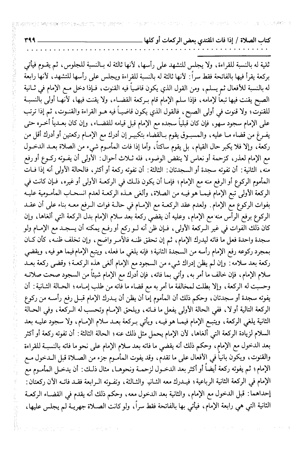 ولعدم عقد الركعة مع الإمام في حالة فوات الرفع معه بناء على أن عقد الركوع برفع الرأس منه مع الإمام، وعليه أن يقضي ركعة بعد سلام الإمام بدل الركعة التي ألغاها، وإن كان ذلك الفوات في غير الركعة الأولى، فإن ظن أنه لو ركع أو رفع يمكنه أن يسجد مع الإمام ولو سجدة واحدة فعل ما فاته ليدرك الإمام، ثم إن تحقق ظنه فالأمر واضح، وإن تخلف ظنه، كأن كان بمجرد ركوعه رفع الإمام رأسه من السجدة الثانية؛ فإنه يلغي ما فعله، ويتبع الإمام فيما هو فيه، ويقضي ركعة بعد سلامه: وإن لم يظن إدراك شيء من السجود مع الإمام ألغى هذه الركعة؛ وقضى ركعة بعد سلام الإمام، فإن خالف ما أمر به، وأتي بما فاته، فإن أدرك مع الإمام شيئاً من السجود صحت صلاته وحسبت له الركعة، وإلا بطلت لمخالفة ما أمر به مع قضاء ما فاته من طلب إمامه؛ الحالة الثانية: أن يفوته سجدة أو سجدتان، وحكم ذلك أن المأموم إما أن يظن أن يدرك الإمام قبل رفع رأسه من ركوع الركعة التالية أو لا، ففي الحالة الأولى يفعل ما فاته، ويلحق الإمام وتحسب له الركعة، وفي الحالة الثانية يلغي الركعة، ويتبع الإمام فيما هو فيه، ويأتي بركعة بعد سلام الإمام، ولا سجود عليه بعد السلام لزيادة الركعة التي ألغاها، لأن الإمام يحمل مثل ذلك عنه؛ الحالة الثالثة: أن تفوته ركعة أو أكثر بعد الدخول مع الإمام، وحكم ذلك أنه يقضي ما فاته بعد سلام الإمام على نحو ما فاته بالنسبة للقراءة والقنوت، ويكون بانياً في الأفعال على ما تقدم، وقد يفوت المأموم جزء من الصلاة قبل الدخول مع الإمام؛ ثم يفوته ركعة أيضاً أو أكثر بعد الدخول لزحمة ونحوها، مثال ذلك: أن يدخل المأموم مع الإمام في الركعة الثانية الرباعية؛ فيدرك معه الثانية والثالثة، وتفوته الرابعة فقد فاته الآن ركعتان: إحداهما: قبل الدخول مع الإمام،