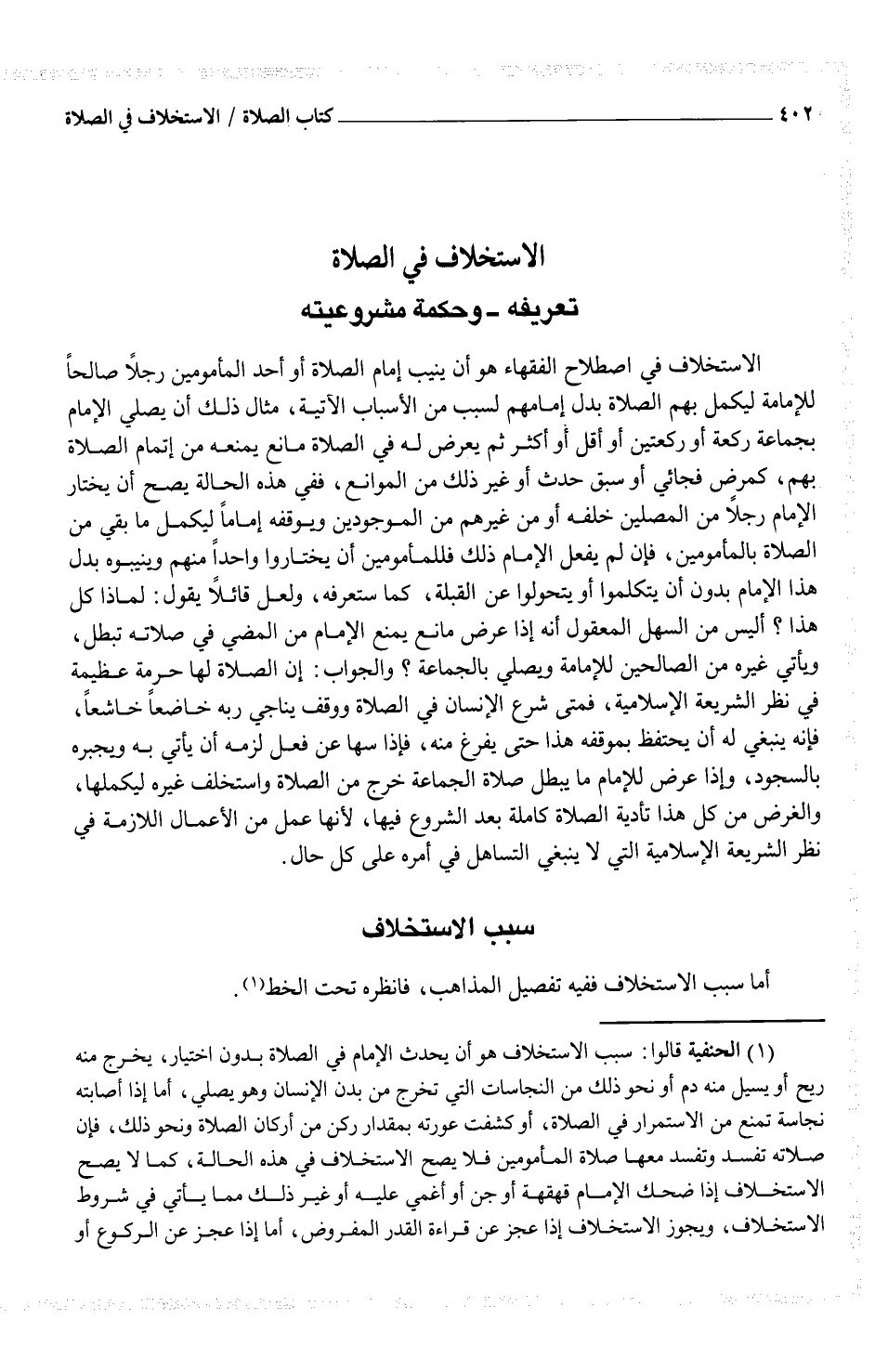 (¬1) الحنفية قالوا: سبب الاستخلاف هو أن يحدث الإمام في الصلاة بدون اختيار، يخرج منه ريح أو يسيل منه دم أو نحو ذلك من النجاسات التي تخرج من بدن الإنسان وهو يصلي، أما إذا أصابته نجاسة تمنع من الاستمرار في الصلاة، أو كشفت عورته بمقدار ركن من أركان الصلاة ونحو ذلك، فإن صلاته تفسد وتفسد معها صلاة المأمومين فلا يصح الاستخلاف في هذه الحالة، كما لا يصح الاستخلاف إذا ضحك الإمام قهقهة أو جن أو أغمي عليه أو غير ذلك مما يأتي في شروط الاستخلاف، ويجوز الاستخلاف إذا عجز عن قراءة القدر المفروض، أما إذا عجز عن الركوع أو