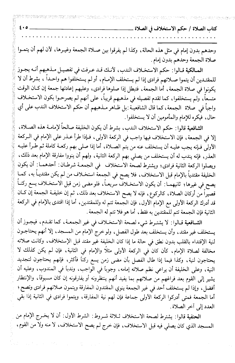 الشافعية قالوا: حكم الاستخلاف الندب، بشرط أن يكون الخليفة صالحاً لإمامة هذه الصلاة، إلا في الجمعة، فإن الاستخلاف فيها واجب في الركعة الأولى، فإذا طرأ عذر على الإمام في الركعة الأولى فإنه يجب عليه أن يستخلف عنه من يتم الصلاة، أما إذا صلى بهم ركعة كاملة ثم طرأ عليه العذر، فإنه يندب له أن يستخلف من يصلي بهم الركعة الثانية، ولهم أن ينووا مفارقة الإمام بعد ذلك، ويصلوا الركعة الثانية فرادى؛ ويشترط لصحة الاستخلاف في الجمعة شرطان: أحدهما: أن يكون الخليفة مقتدياً بالإمام قبل الاستخلاف، فلا يصح في الجمعة استخلاف من لم يكن مقتدياً به، كما يصح في غيرها؛ ثانيهما: أن يكون الاستخلاف سريعاً، فلو مضى زمن قبل الاستخلاف يسع ركناً قصيراً من أركان الصلاة، كالركوع، فإنه لا يصح الاستخلاف بعد ذلك، ثم إن خليفة الجمعة إن كان قد أدرك الركعة الأولى مع الإمام الأولى، فإن الجمعة تتم له وللمقتدين، أما إذا اقتدى بالإمام في الركعة الثانية فإن الجمعة تتم للمقتدين به فقط، أما هو فلا تتم له الجمعة.