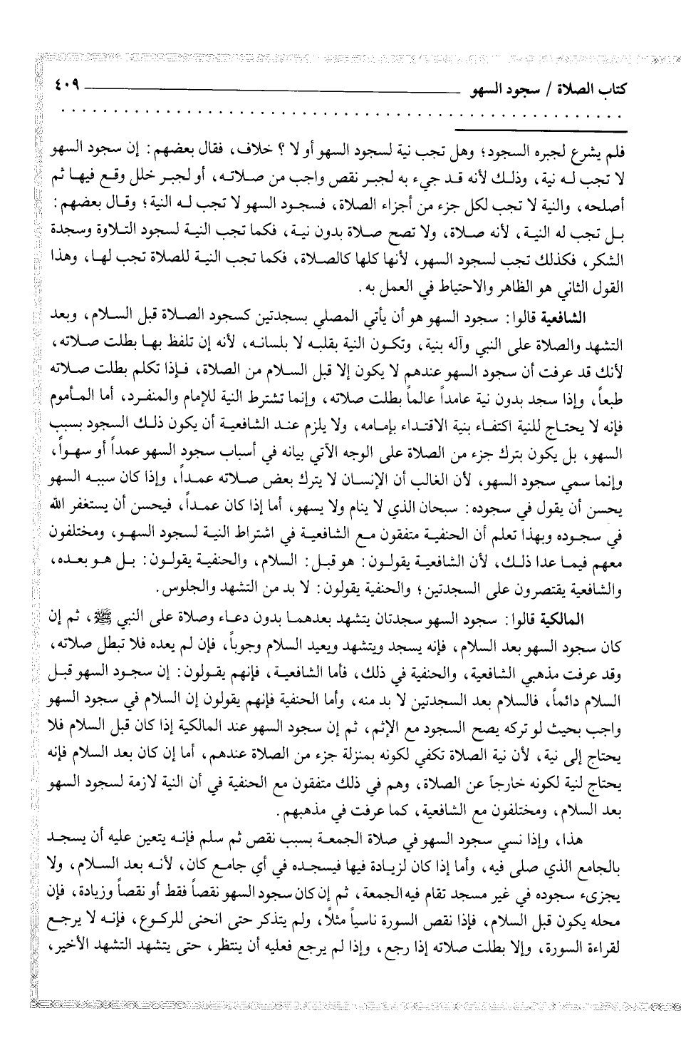 الشافعية قالوا: سجود السهو هو أن يأتي المصلي بسجدتين كسجود الصلاة قبل السلام، وبعد التشهد والصلاة على النبي وآله بنية، وتكون النية بقلبه لا بلسانه، لأنه إن تلفظ بها بطلت صلاته، لأنك قد عرفت أن سجود السهو عندهم لا يكون إلا قبل السلام من الصلاة، فإذا تكلم بطلت صلاته طبعاً، وإذا سجد بدون نية عامداً عالماً بطلت صلاته، وإنما تشترط النية للإمام والمنفرد، أما المأموم فإنه لا يحتاج للنية اكتفاء بنية الاقتداء بإمامه، ولا يلزم عند الشافعية أن يكون ذلك السجود بسبب السهو، بل يكون بترك جزء من الصلاة على الوجه الآتي بيانه في أسباب سجود السهو عمداً أو سهواً، وإنما سمي سجود السهو، لأن الغالب أن الإنسان لا يترك بعض صلاته عمداً، وإذا كان سببه السهو يحسن أن يقول في سجوده: سبحان الذي لا ينام ولا يسهو، أما إذا كان عمداً، فيحسن أن يستغفر الله في سجوده وبهذا تعلم أن الحنفية متفقون مع الشافعية في اشتراط النية لسجود السهو، ومختلفون معهم فيما عدا ذلك، لأن الشافعية يقولون: هو قبل: السلام، والحنفية يقولون: بل هو بعده، والشافعية يقتصرون على السجدتين؛ والحنفية يقولون: لا بد من التشهد والجلوس.