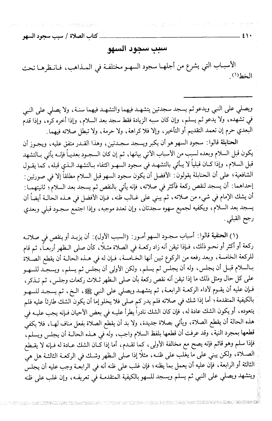 (¬1) الحنفية قالوا: أسباب سجود السهو أمور: "السبب الأول": أن يزيد أو ينقص في صلاته ركعة أو أكثر أو نحو ذلك، فإذا تيقن أنه زاد ركعة في الصلاة مثلاً، كأن صلى الظهر أربعاً، ثم قام للركعة الخامسة، وبعد رفعه من الركوع تبين أنها الخامسة، فإن له في هذه الحالة أن يقطع الصلاة بالسلام قبل أن يجلس، وله أن يجلس ثم يسلم، ولكن الأولى أن يجلس ثم يسلم، ويسجد للسهو على كل حال ومثل ذلك ما إذا تيقن أنه نقص ركعة بأن صلى الظهر ثلاث ركعات وجلس، ثم تذكر، فإن عليه أن يقوم لأداء الركعة الرابعة، ثم يتشهد ويصلي على النبي صلى الله عليه وسلم، الخ، ثم يسجد للسهو بالكيفية المتقدمة؛ أما إذا شك في صلاته فلم يدر كم صلى فلا يخلو إما أن يكون الشك طارئاً عليه فلم يتعوده، أو يكون الشك عادة له، فإن كان الشك نادراً يطرأ عليه في بعض الأحيان فإنه يجب عليه في هذه الحالة أن يقطع الصلاة، ويأتي بصلاة جديدة، ولا بد أن يقطع الصلاة بفعل مناف لها، فلا يكفي قطعها بمجرد النية، وقد عرفت أن قطعها بلفظ السلام واجب، وله في هذه الحالة أن يجلس ويسلم، فإذا سلم وهو قائم فإنه يصح مع مخالفة الأولى، كما تقدم، أما إذا كان الشك عادة له فإنه لا يقطع الصلاة، ولكن يبني على ما يغلب على ظنه، مثلاً إذا صلى الظهر وشك في الركعة الثالثة هل هي الثالثة أو الرابعة، فإن عليه أن يعمل بما يظنه؛ فإن غلب على ظنه أنه في الرابعة وجب عليه أن يجلس ويتشهد ويصلي على النبي ثم يسلم ويسجد للسهو بالكيفية المتقدمة في تعريفه، وإن غلب على ظنه