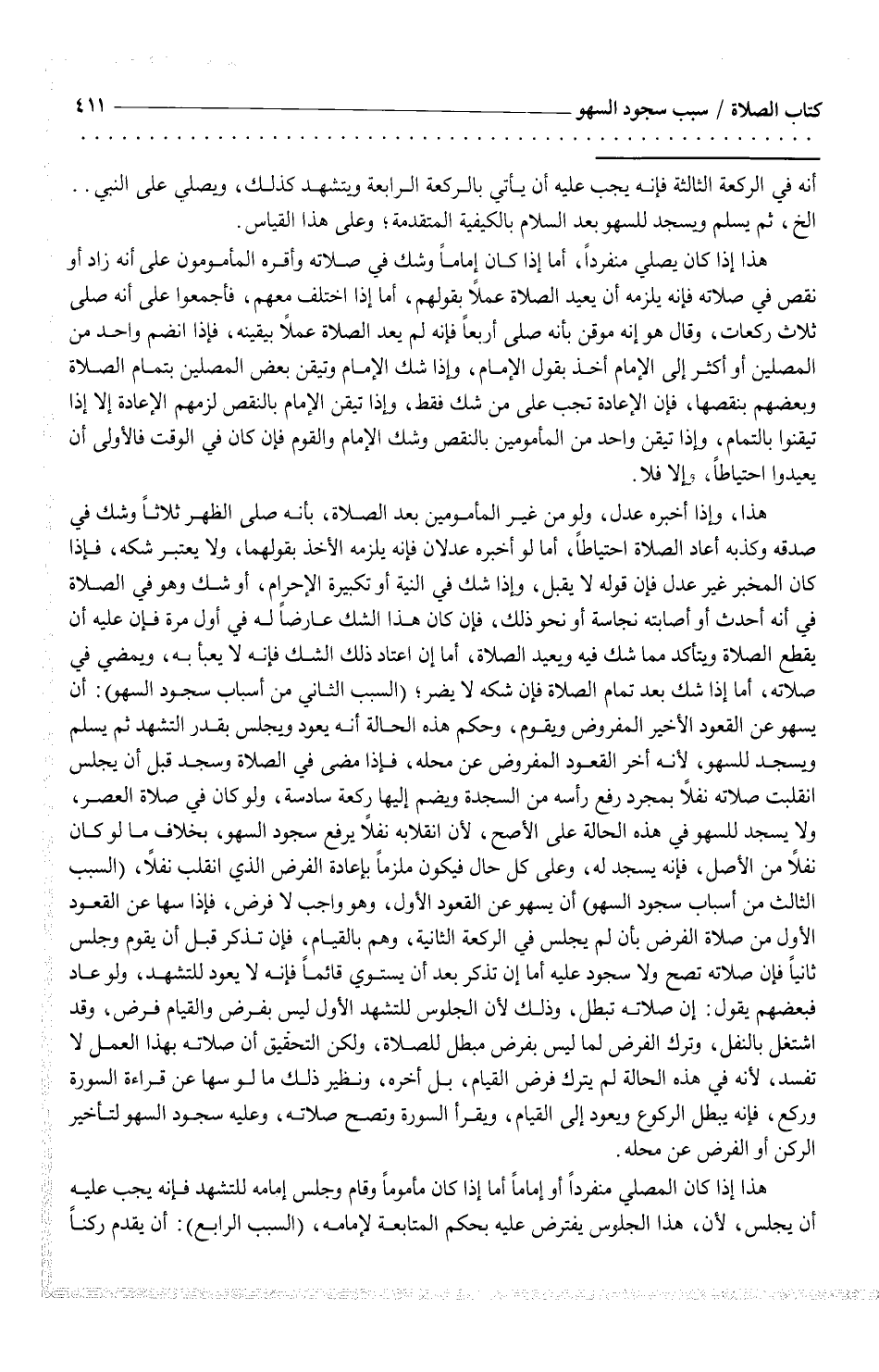 هذا، وإذا أخبره عدل، ولو من غير المأمومين بعد الصلاة، بأنه صلى الظهر ثلاثاً وشك في صدقه وكذبه أعاد الصلاة احتياطاً، أما لو أخبره عدلان فإنه يلزمه الأخذ بقولهما، ولا يعتبر شكه، فإذا كان المخبر غير عدل فإن قوله لا يقبل، وإذا شك في النية أو تكبيرة الإحرام، أو شك وهو في الصلاة في أنه أحدث أو أصابته نجاسة أو نحو ذلك، فإن كان هذا الشك عارضاً له في أول مرة فإن عليه أن يقطع الصلاة ويتأكد مما شك فيه ويعد الصلاة، أما إن اعتاد ذلك الشك فإنه لا يعبأ به، ويمضي في صلاته، أما إذا شك بعد تمام الصلاة فإن شكه لا يضر؛ "السبب الثاني من أسباب سجود السهو": أن يسهو عن القعود الأخير المفروض ويقوم، وحكم هذه الحالة أنه يعود ويجلس بقدر التشهد ثم يسلم ويسجد للسهو، لأنه أخر القعود المفروض عن محله، فإذا مضى في الصلاة وسجد قبل أن يجلس انقلبت صلاته نفلاً بمجرد رفع رأسه من السجدة ويضم إليها ركعة سادسة، ولو كان في صلاة العصر، ولا يسجد للسهو في هذه الحالة على الأصح، لأنه انقلابه نفلاً يرفع سجود السهو، بخلاف ما لو كان نفلاً من الأصل، فإنه يسجد له، وعلى كل حال فيكون ملزماً بإعادة الفرض الذي انقلب نفلاً، "السبب الثالث من أسباب سجود السهو" أن يسهو عن القعود الأول، وهو واجب لا فرض، فإذا سها عن القعود الأول من صلاة الفرض بأن لم يجلس في الركعة الثانية، وهم بالقيام، فإن تذكر قبل أن يقوم وجلس ثانياً فإن صلاته تصح ولا سجود عليه أما إن تذكر بعد أن يستوي قائماً فإنه لا يعود للتشهد، ولو عاد فبعضهم يقول: إن صلاته تبطل، وذلك لأن الجلوس للتشهد الأول ليس بفرض والقيام فرض، وقد اشتغل بالنفل، وترك الفرض لما ليس بفرض مبطل للصلاة، ولكن التحقيق أن صلاته بهذا العمل لا تفسد، لأنه في هذه الحالة لم يترك فرض القيام، بل أخره، ونظير ذلك