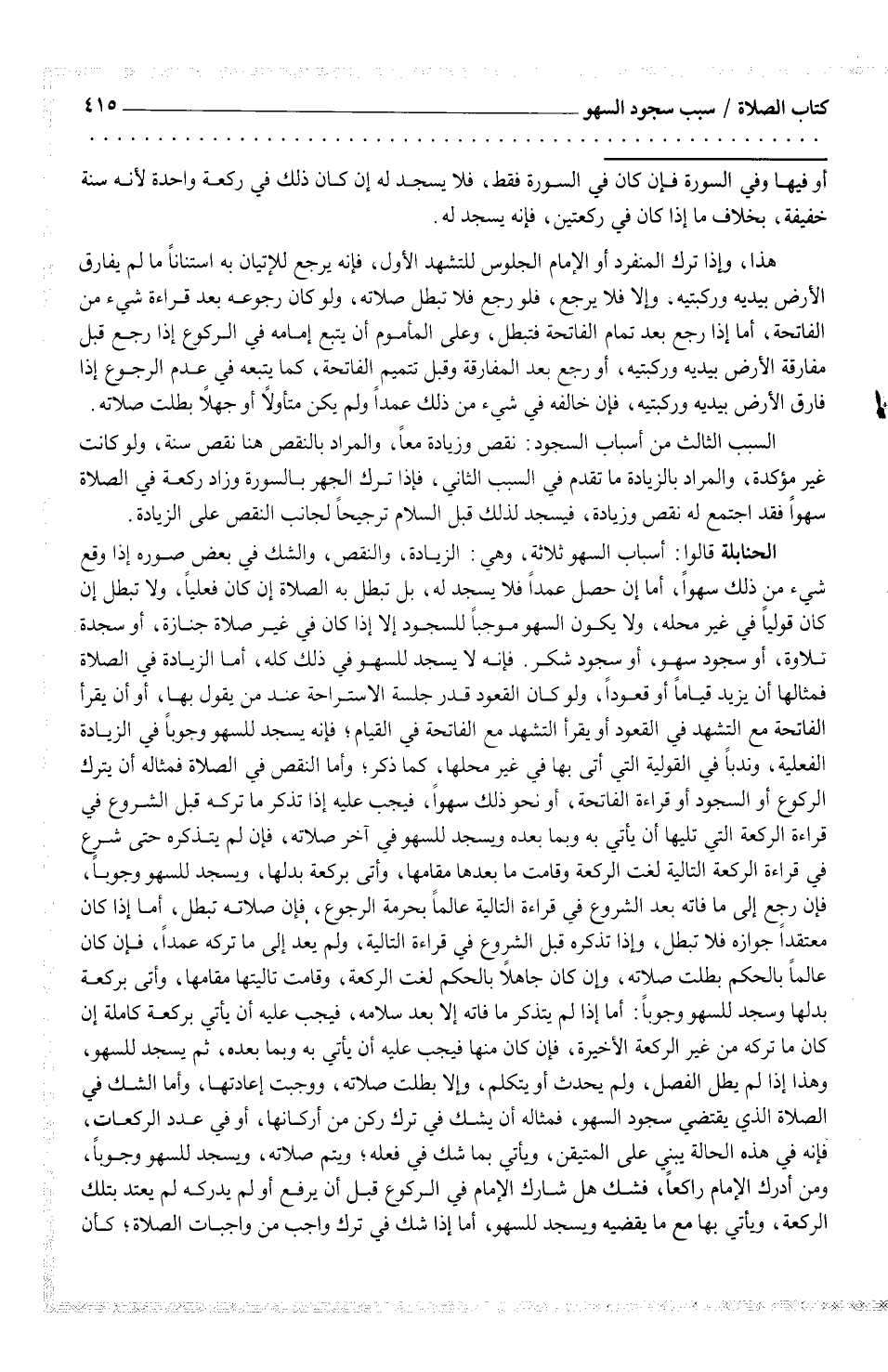 الحنابلة قالوا: أسباب السهو ثلاثة، وهي: الزيادة، والنقص، والشك في بعض صوره إذا وقع شيء من ذلك سهواً، أما إن حصل عمداً فلا يسجد له، بل تبطل به الصلاة إن كان فعلياً، ولا تبطل إن كان قولياً في غير محله، ولا يكون السهو موجباً للسجود إلا إذا كان في غير صلاة جنازة، أو سجدة تلاوة، أو سجود سهو، أو سجود شكر.