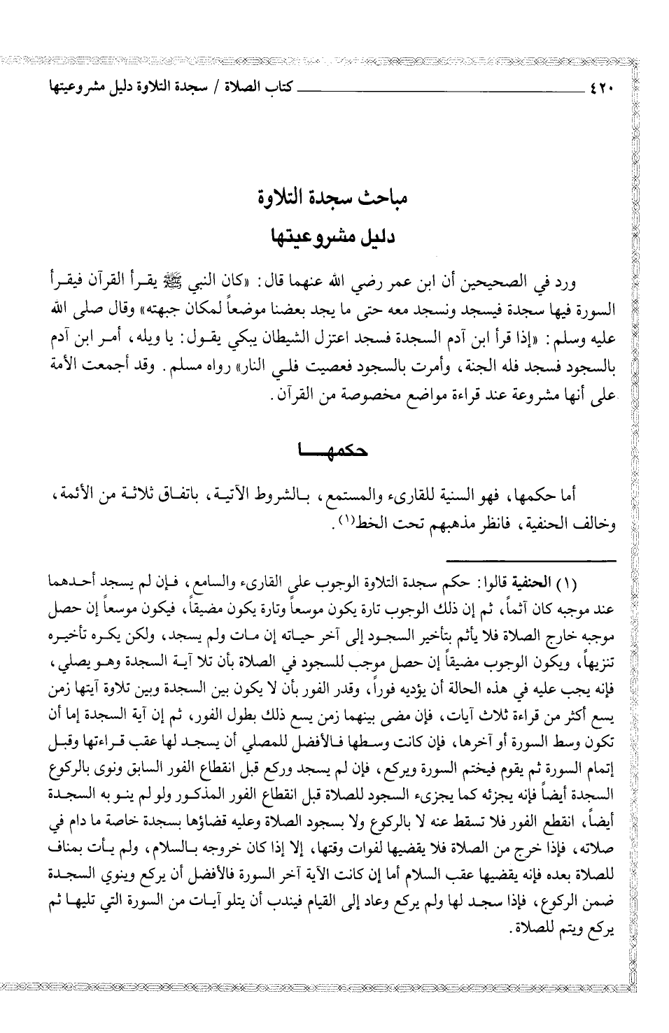 (¬1) الحنفية قالوا: حكم سجدة التلاوة الوجوب تارة يكون موسعاً وتارة يكون مضيقاً، فيكون موسعاً إن حصل موجبه خارج الصلاة فلا يأثم بتأخير السجود إلى آخر حياته إن مات ولم يسجد، ولكن يكره تأخيره تنزيهاً، ويكون الوجوب مضيقاً إن حصل موجب للسجود في الصلاة بأن تلا آية السجدة وهو يصلي، فإنه يجب عليه في هذه الحالة أن يؤديه فوراً، وقدر الفور بأن لا يكون بين السجدة وبين تلاوة آيتها زمن يسع أكثر من قراءة ثلاث آيات، فإن مضى بينهما زمن يسع ذلك بطول الفور، ثم إن آية السجدة إما أن تكون وسط السورة أو آخرها، فإن كانت وسطها فالأفضل للمصلي أن يسجد لها عقب قراءتها وقبل إتمام السورة ثم يقوم فيختم السورة ويركع، فإن لم يسجد وركع قبل انقطاع الفور السابق ونوى بالركوع السجدة أيضاً فإنه يجزئه كما يجزئ السجود للصلاة قبل انقطاع الفور المذكور ولو لم ينوبه السجدة أيضاً، انقطع الفور فلا تسقط عنه لا بالركوع ولا بسجود الصلاة وعليه قضاءها بسجدة خاصة ما دام في صلاته، فإذا خرج من الصلاة فلا يقضيها لفوات وقتها، إلا إذا كان خروجه بالسلام، ولم يأت بمناف للصلاة بعده فإنه يقضيها عقب السلام أما إن كانت الآية آخر السورة فالأفضل أن يركع وينوي السجدة ضمن الركوع، فإذا سجد لها ولم يركع وعاد إلى القيام فيندب أن يتلو آيات من السورة التي تليها ثم يركع ويتم للصلاة