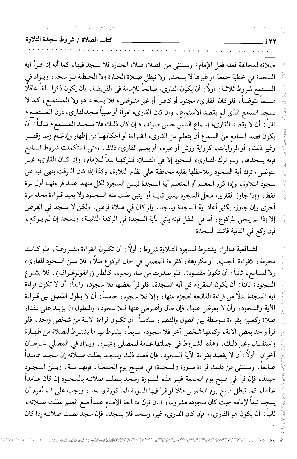 صلاته لمخالفة فعله فعل الإمام؛ ويستثنى من الصلاة صلاة الجنازة فلا يسجد فيها، كما أنه إذا قرأ آية السجدة في خطبة جمعة أو غيرها لا يسجد، ولا تبطل صلاة الجنازة ولا الخطبة لو سجد، ويزاد في المستمع شروط ثلاثة: أولاً: أن يكون القارئ صالحاً للإمامة في الفريضة، بأن يكون ذكراً بالغاً عاقلاً مسلماً متوضئاً، فلو كان القارئ مجنوناً أو كافراً أو غير متوضئ فلا يسجد هو ولا المستمع، كما لا يسجد السامع الذي لم يقصد الاستماع، وإن كان القارئ امرأة أو صبياً سجد القارئ دون المستمع؛ ثانياً: أن لا يقصد القارئ إسماع الناس حسن صوته، فإن كان ذلك فلا يسجد المستمع؛ ثالثاً: أن يكون قصد السامع من السماع أن يتعلم من القارئ القراءة أو أحكامها من إظهار وإدغام ومد وقصر وغير ذلك، أو الروايات، كرواية ورش أو غيره، أو يعلم القارئ ذلك، ومتى استكملت شروط السامع فإنه يسجدها، ولو ترك القارئ السجود إلا في الصلاة فيتركها تبعاً للإمام، وإذا كان القارئ غير متوضئ ترك آية السجود ويلاحظها بقلبه محافظة على نظام التلاوة، وكذا إذا كان الوقت ينهي فيه عن سجود التلاوة، وإذا كرر المعلم أو المتعلم آية السجدة فيسن السجود لكل منهما عند قراءتها أول مرة فقط، وإذا جاوز القارئ محل السجود بيسير كآية أو آيتين طلب منه السجود ولا يعيد قراءة محله مرة أخرى وإن جاوره بكثير أعاد آية السجدة وسجد، ولو كان في صلاة فرض، ولكن لا يسجد في الفرض إلا إذا لم ينحن للركوع؛ أما في النفل فإنه يأتي بآية السجدة في الركعة الثانية، ويسجد إن لم يركع، فإن ركع في الثانية فاتت السجدة.