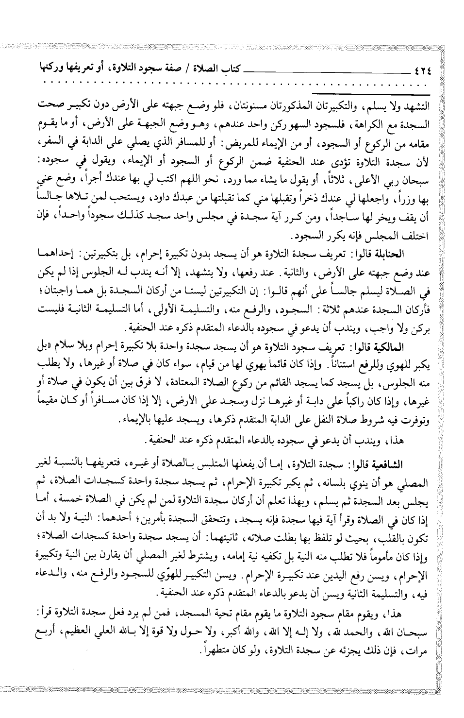 الشافعية قالوا: سجدة التلاوة، إما أن يفعلها المتلبس بالصلاة أو غيره، فتعريفها بالنسبة لغير المصلي هو أن ينوي بلسانه، ثم يكبر تكبيرة الإحرام، ثم يسجد سجدة واحدة كسجدات الصلاة، ثم يجلس بعد السجدة ثم يسلم، وبهذا تعلم أن أركان سجدة التلاوة لمن لم يكن في الصلاة خمسة، أما إذا كان في الصلاة وقرأ آية فيها سجدة فإنه يسجد، وتتحقق السجدة بأمرين؛ أحدهما: النية ولا بد أن تكون بالقلب، بحيث لو تلفظ بها بطلت صلاته، ثانيتهما: أن يسجد سجدة واحدة كسجدات الصلاة؛ وإذا كان مأموماً فلا تطلب منه النية بل تكفيه نية إمامه، ويشترط لغير المصلي أن يقارن بين النية وتكبيرة الإحرام، ويسن رفع اليدين عند تكبيرة الإحرام، ويسن التكبير للهوّي للسجود والرفع منه، والدعاء فيه، والتسليمة الثانية ويسن أن يدعو بالدعاء المتقدم ذكره عند الحنفية.