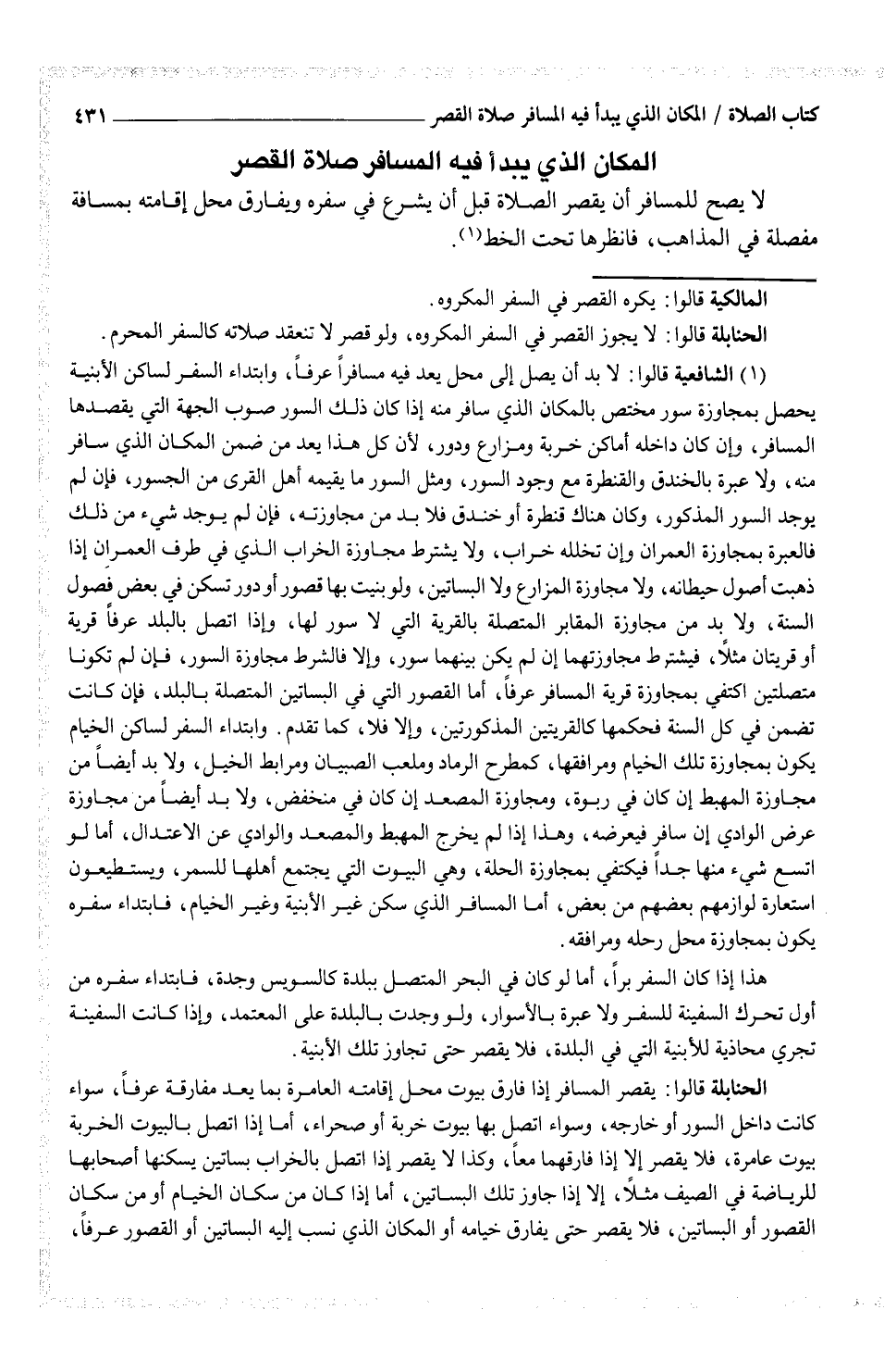 (¬1) الشافعية قالوا: لا بد أن يصل إلى محل يعد فيه مسافراً عرفاً، وابتداء السفر لساكن الأبنية يحصل بمجاوزة سور مختص بالمكان الذي سافر منه إذا كان ذلك السور صوب الجهة التي يقصدها المسافر، وإن كان داخله أماكن خربة ومزارع ودور، لأن كل هذا يعد من ضمن المكان الذي سافر منه، ولا عبرة بالخندق والقنطرة مع وجود السور، ومثل السور ما يقيمه أهل القرى من السجور، فإن لم يوجد السور المذكور، وكان هناك قنطرة أو خندق فلا بد من مجاوزته، فإن لم يوجد شيء من ذلك فالعبرة بمجاوزة العمران وإن تخلله خراب، ولا يشترط مجاوزة الخراب الذي في طرف العمران إذا ذهبت أصول حيطانه، ولا مجاوزة المزارع ولا البساتين، ولو بنيت بها قصور أو دور تسكن في بعض فصول السنة، ولا بد من مجاوزة المقابر المتصلة بالقرية التي لا سور لها، وإذا اتصل بالبلد عرفاً قرية أو قريتان مثلاً، فيشترط مجاوزتهما إن لم يكن بينهما سور، وإلا فالشرط مجاوزة السور، فإن لم تكونا متصلتين اكتفي بمجاوزة قرية المسافر عرفاً، أما القصور التي في البساتين المتصلة بالبلد، فإن كانت تضمن في كل السنة فحكمها كالقريتين المذكورتين، وإلا فلا، كما تقدم.