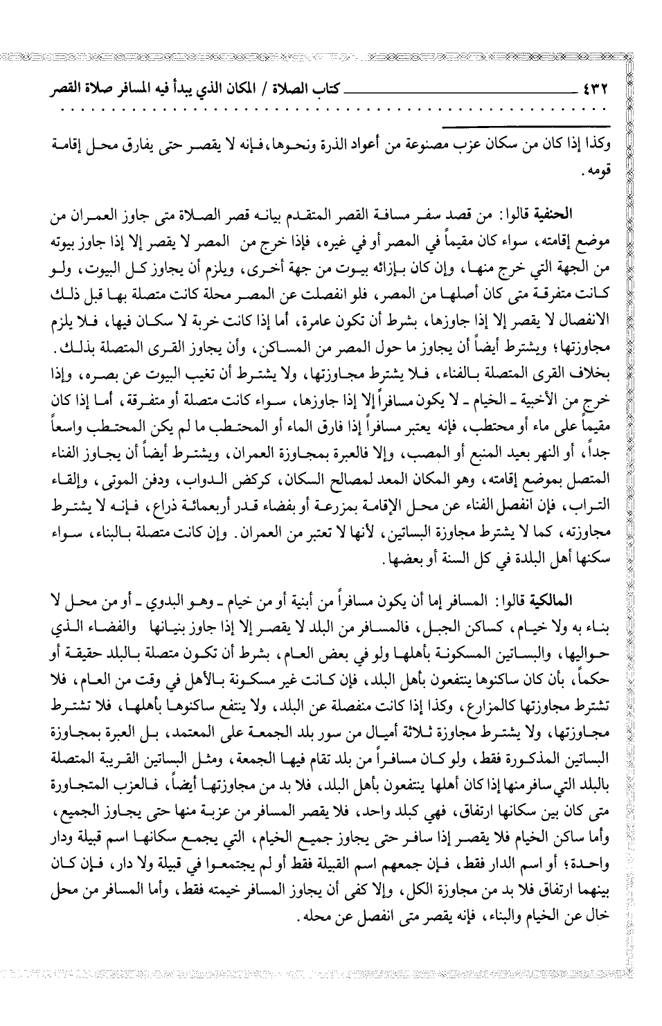 المالكية قالوا: المسافر إما أن يكون مسافراً من أبنية أو من خيام - وهو البدوي - أو من محل لا بناء به ولا خيام، كساكن الجبل، فالمسافر من البلد لا يقصر إلا إذا جاوز بنيانها والفضاء الذي حواليها، والبساتين المسكونة بأهلها ولو في بعض العام، بشرط أن تكون متصلة بالبلد حقيقة أو حكماً، بأن كان ساكنوها ينتفعون بأهل البلد، فإن كانت غير مسكونة بالأهل في وقت من العام، فلا تشترط مجاوزتها كالمزارع، وكذا إذا كانت منفصلة عن البلد، ولا ينتفع ساكنوها باهلها، فلا تشترط مجاوزتها، ولا يشترط مجاوزة ثلاثة أميال من سور بلد الجمعة على المعتمد، بل العبرة بمجاوزة البساتين المذكورة فقط، ولو كان مسافراً من بلد تقام فيها الجمعة، ومثل البساتين القريبة المتصلة بالبلد التي سافر منها إذا كان أهلها ينتفعون بأهل البلد، فلا بد من مجاوزتها أيضاً، فالعزب المتجاورة متى كان بين سكانها ارتفاق، فهي كبلد واحد، فلا يقصر المسافر من عربة منها حتى يجاوز الجميع، وأما ساكن الخيام فلا يقصر إذا سافر حتى يجاوز جميع الخيام، التي يجمع سكانها اسم قبيلة ودار واحدة؛ أو اسم الدار فقط، فإن جمعهم اسم القبيلة فقط أو لم يجتمعوا في قبيلة ولا دار، فإن كان بينهما ارتفاق فلا بد من مجاوزة الكل، وإلا كفى أن يجاوز المسافر خيمته فقط، وأما المسافر من محله خال عن الخيام والبناء، فإنه يقصر متى انفصل عن محله