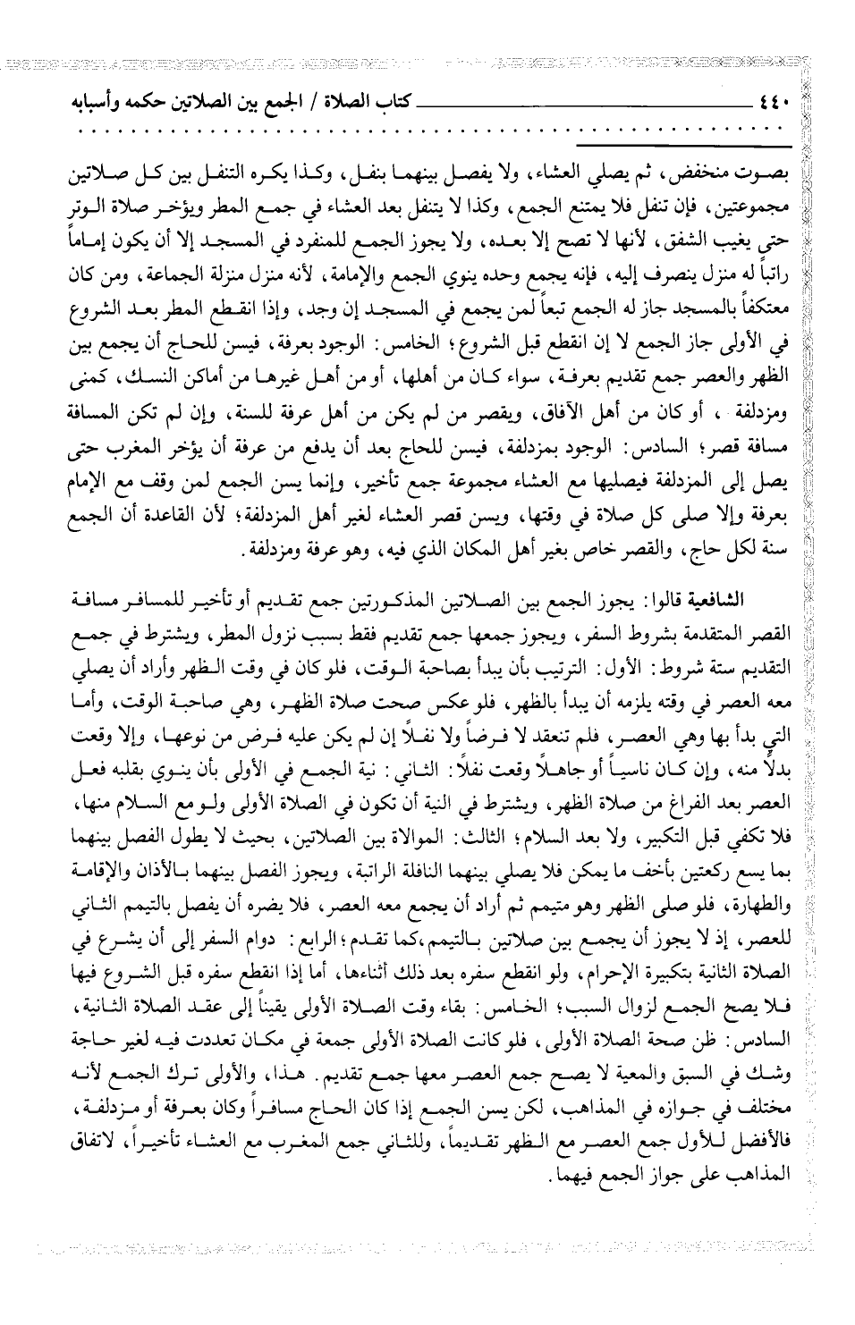 الشافعية قالوا: يجوز الجمع بين الصلاتين المذكورتين جمع تقديم أو تأخير للمسافر مسافة القصر المتقدمة بشروط السفر، ويجوز جمعها جمع تقديم فقط بسبب نزول المطر، ويشترط في جميع التقديم ستة شروط: الأول: الترتيب بأن يبدأ بصاحبة الوقت، فلو كان في وقت الظهر وأراد أن يصلي معه العصر في وقته يلزمه أن يبدأ بالظهر، فلو عكس صحت صلاة الظهر، وهي صاحبة الوقت، وأما التي بدأ بها وهي العصر، فلم تنعقد لا فرضاً ولا نفلاً إن لم يكن عليه فرض من نوعها، وإلا وقعت بدلاً منه، وإن كان ناسياً أو جاهلاً وقعت نفلاً: الثاني: نية الجمع في الأولى بأن ينوي بقلبه فعل العصر بعد الفراغ من صلاة الظهر، ويشترط في النية أن تكون في الصلاة الأولى ولو مع السلام منها، فلا تكفي قبل التكبير، ولا بعد السلام؛ الثالث: الموالاة بين الصلاتين، بحيث لا يطول الفصل بينهما بما يسع ركعتين بأخف ما يمكن فلا يصلي بينهما النافلة الراتبة، ويجوز الفصل بينهما بالأذان والإقامة والطهارة، فلو صلى الظهر وهو متيمم ثم أراد أن يجمع معه العصر، فلا يضره أن يفصل بالتيمم الثاني للعصر، إذا لا يجوز أن يجمع بين صلاتين بالتيمم، كما تقدم؛ الرابع: دوام السفر إلى أن يشرع في الصلاة الثانية بتكبيرة الإحرام، ولو انقطع سفره بعد ذلك أثناءها، أما إذا انقطع سفره قبل الشروع فيها فلا يصح الجمع لزوال السبب؛ الخامس: بقاء وقت الصلاة الأولى جمعة في مكان تعددت فيه لغير حاجة وشك في السبق والمعية لا يصح جمع العصر معها جمع تقديم. هذا، والأولى ترك الجمع لأنه مختلف في جوازه في المذاهب، لكن يسن الجمع إذا كان الحاج مسافراً وكان بعرفة أو مزدلفة، فالأفضل للأول جمع العصر مع الظهر تقديماً، وللثاني جمع المغرب مع العشاء تأخيراً، لاتفاق المذاهب على جواز الجمع فيهما.