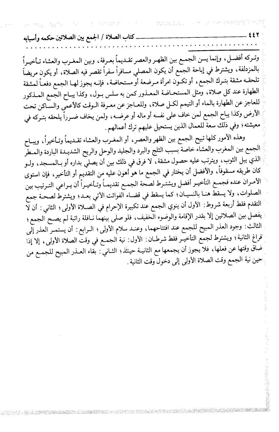 وتركه أفضل، وإنما يسن الجمع بين الظهر والعصر تقديماً بعرفة، وبين المغرب والعشاء تأخيراً بالمزدلفة، ويشترط في غباحة الجمع أن يكون المصلي مسافراً سفراً تقصر فيه الصلاة، أو يكون مريضاً تلحقه مشقة بترك الجمع، أو تكون امرأة مرضعة أو مستحاضة، فإنه يجوز لها الجمع دفعاً لمشقة الطهارة عند كل صلاة، ومثل المستحاضة المعذور كمن به سلس بول، وكذا يباح الجمع المذكور للعاجز عن الطهارة بالماء أو التيمم لكل صلاة، وللعاجز عن معرفة الوقت كالأعمى والساكن تحت الأرض وكذا يباح الجمع لمن خاف على نفسه أو ماله أو عرضه، ولمن يخاف ضرراً يلحقه بتركه في معيشته؛ وفي ذلك سعة للعمال الذين يستحيل عليهم ترك أعمالهم.