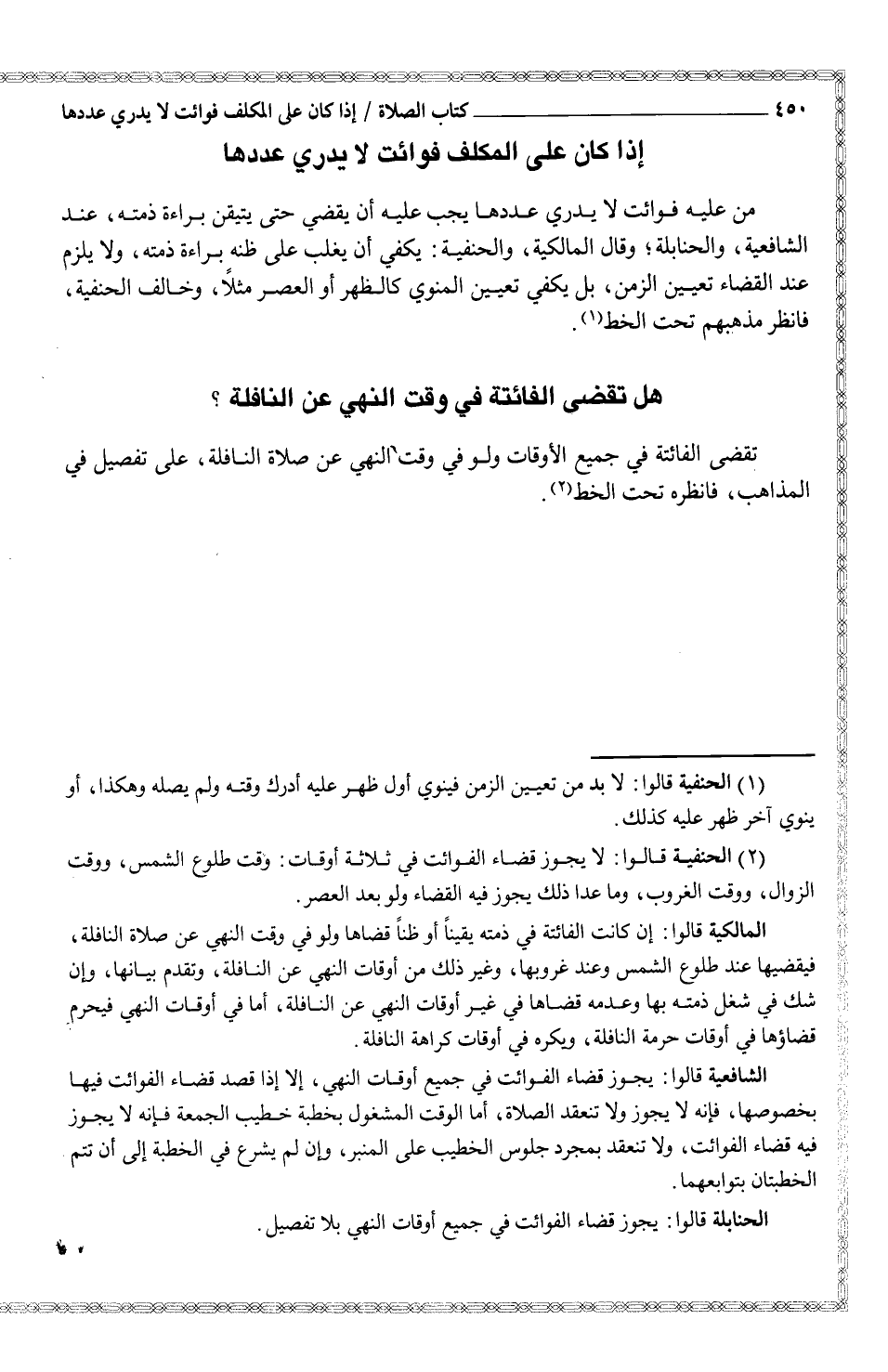 من عليه فوائت لا يدري عددها يجب عليه أن يقضي حتى يتيقن براءة ذمته، عند الشافعية، والحنابلة؛ وقال المالكية، والحنفية: يكفي أن يغلب على ظنه براءة ذمته، ولا يلزم عند القضاء تعيين الزمن، بل يكفي تعيين المنوي كالظهر أو العصر مثلاً، وخالف الحنفية، فانظر مذهبهم تحت الخط (¬1) .