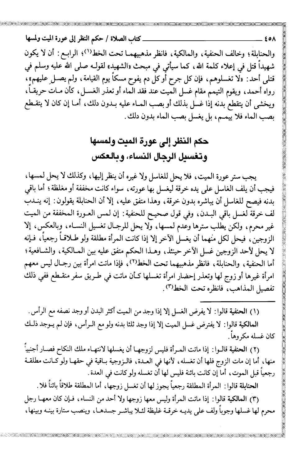 يجب ستر عورة الميت، فلا يحل للغاسل ولا غيره أن ينظر إليها، وكذلك لا يحل لمسها، فيجب أن يلف الغاسل على يده خرقة ليغسل بها عورته، سواء كانت مخففة أو مغلظة؛ أما باقي بدنه فيصح للغاسل أن يباشر بدون خرقة، وهذا متفق عليه، إلا أن الحنابلة يقولون: إنه يندب لف خرقة لغسل باقي البدن، وفي قول صحيح للحنفية: إن لمس العورة المخففة من الميت غير محرم، ولكن يطلب سترها وعدم لمسها، ولا يحل للرجال تغسيل النساء، وبالعكس، إلا الزوجين، فيحل لكل منهما أن يغسل الآخر إلا إذا كانت المرأة مطلقة ولو طلاقاً رجعياً، فإنه لا يحل لأحد الزوجين غسل الآخر حينئذ، وهذا الحكم متفق عليه بين المالكية، والشافعية؛ أما الحنفية، والحنابلة، فانظر مذهبيهما تحت الخط (¬2) ، فإذا ماتت امرأة بين رجال ليس معهم امرأة غيرها أو زوج لها وتعذر إحضار امرأة تغسلها كأن ماتت في طريق سفر منقطع ففي ذلك تفصيل المذاهب، فانظره تحت الخط (¬3)
