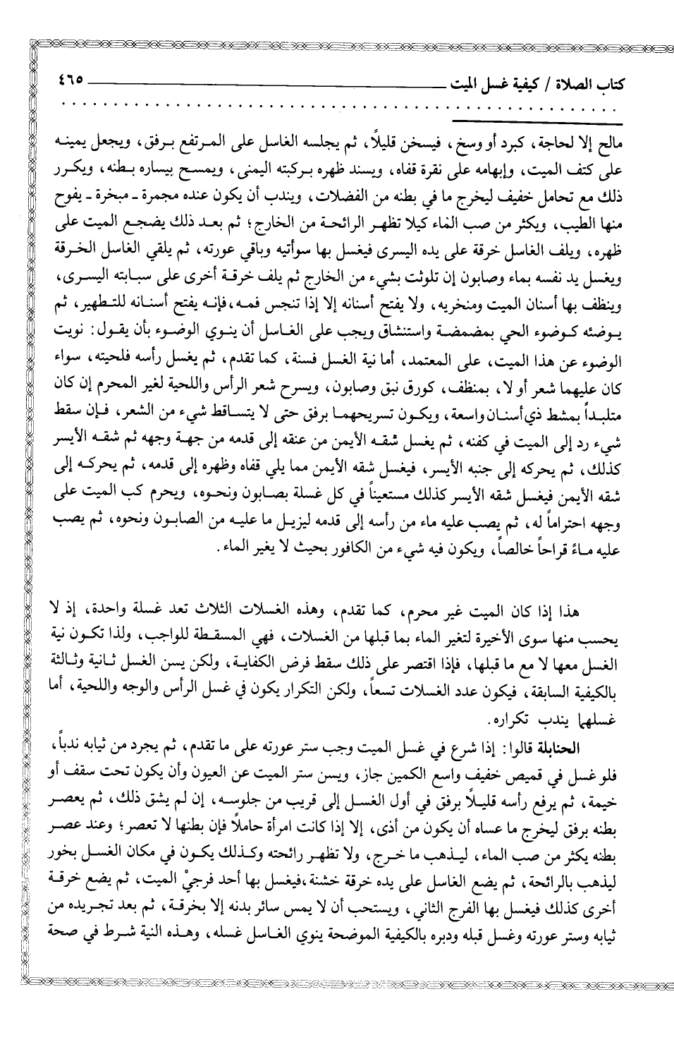 الأيمن فيغسل شقه الأيسر كذلك مستعيناً في كل غسلة بصابون ونحوه، ويحرم كب الميت على وجهه احتراماً له، ثم يصب عليه ماء من رأسه إلى قدمه ليزيل ما عليه من الصابون ونحوه، ثم يصل عليه ماءً قراحاً خالصاً، ويكون فيه شيء من الكافور بحيث لا يغير الماء.